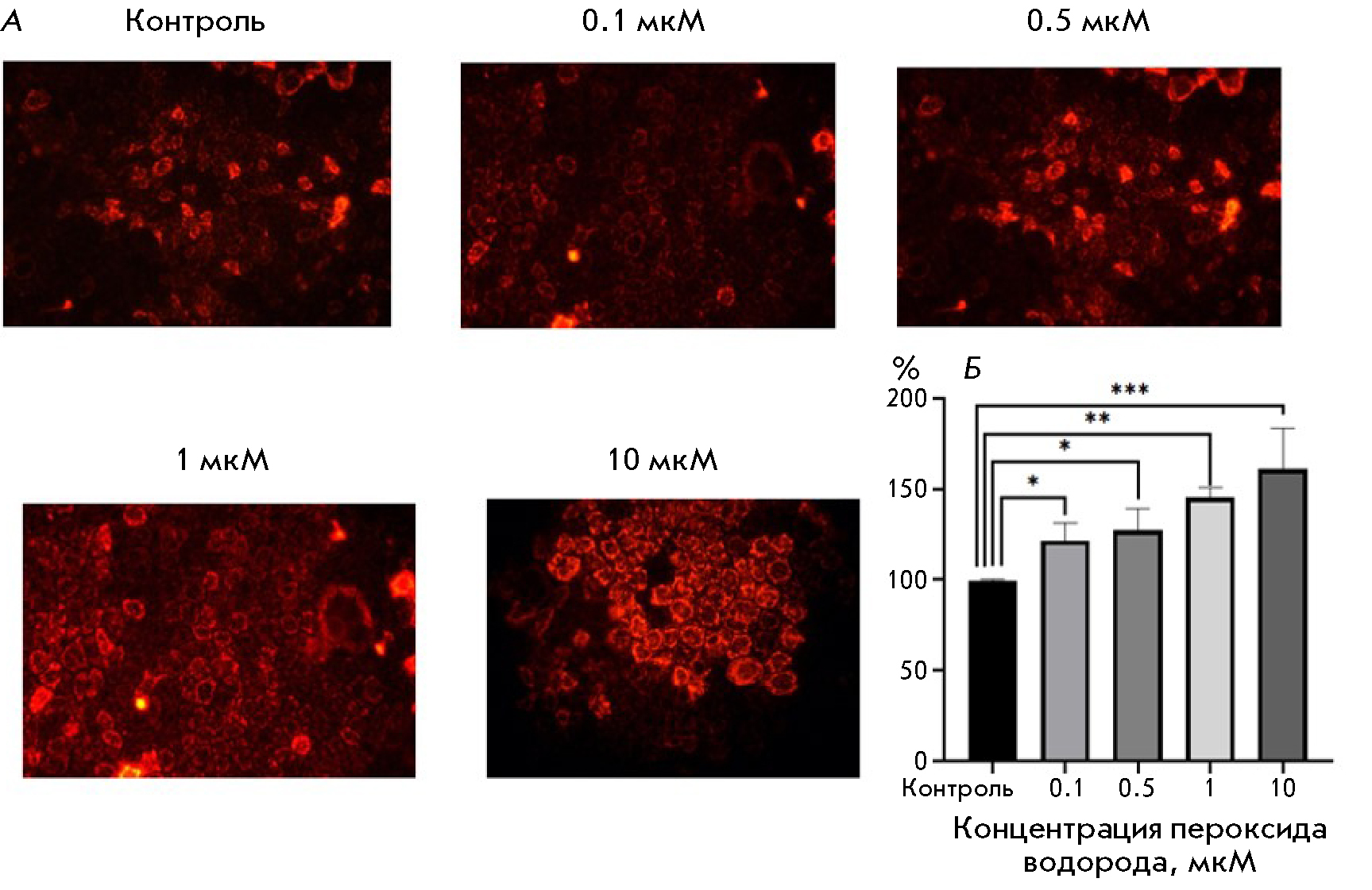 Fig. 1. Hydrogen peroxide (H2O2)-induced changes in the ROS level in Caco-2 cells. (A) Staining with MitoTracker Red CM-H2XRos; magnification: 400×. (B) Fluorescence intensity in a cell lysate. *p ≤ 0.05; **p < 0.01; ***p ≤ 0.001 compared with control (Dunnett’s test)