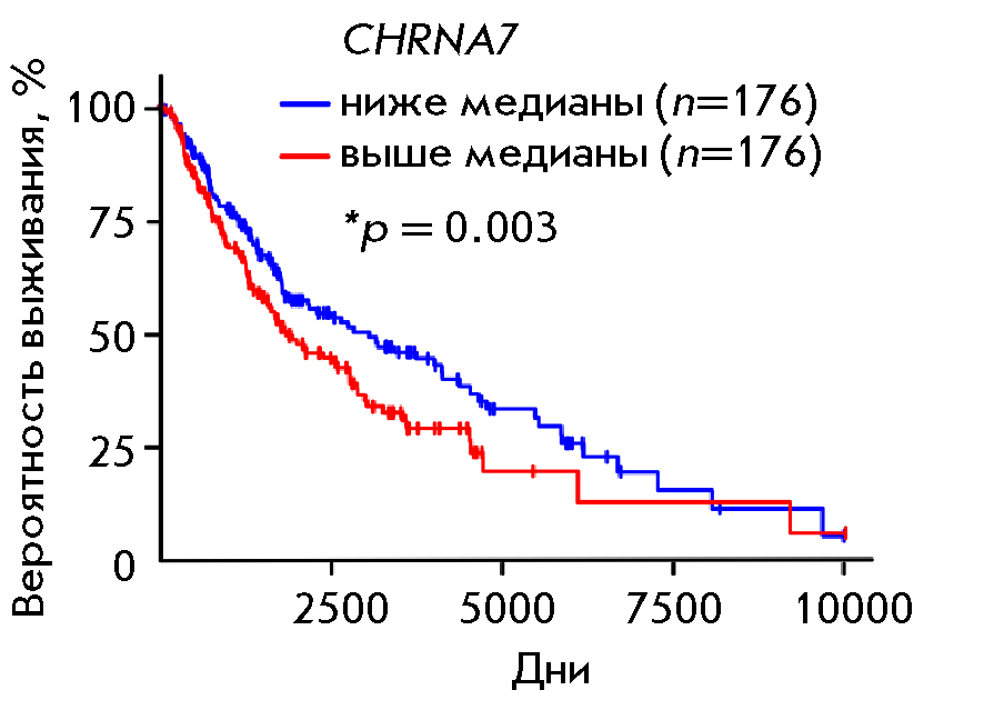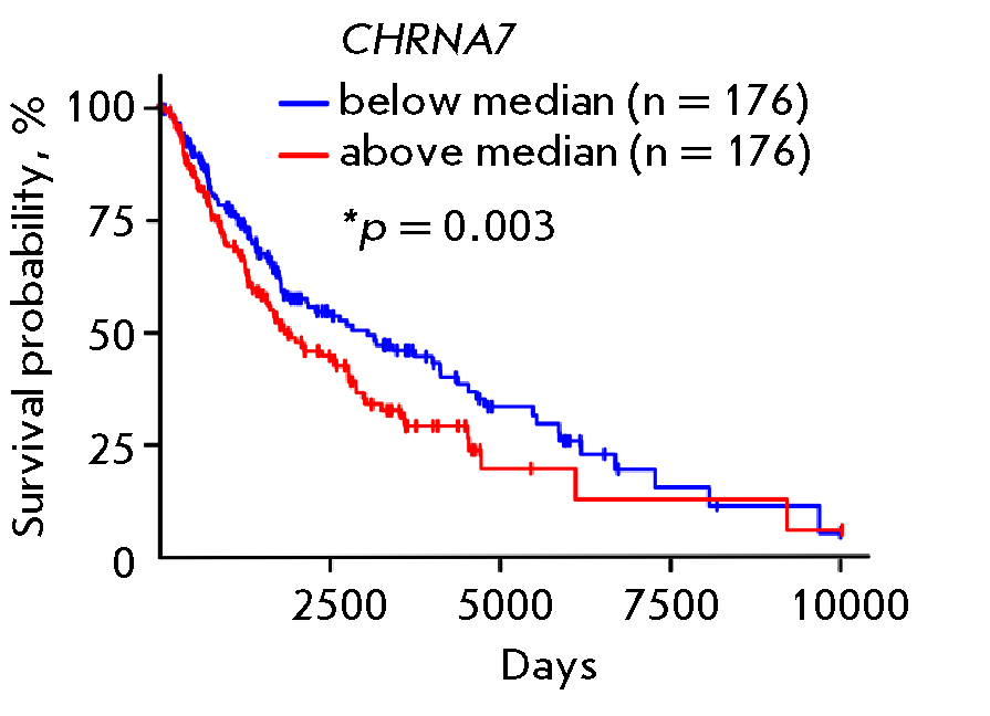 Чтобы понять, как уровень экспрессии CHRNA7 может влиять на развитие онкогенных процессов и, в частности, коррелировать со злокачественностью клеток, мы провели биоинформатический анализ экспрессии этого рецептора в образцах биопсии пациентов с метастатической меланомой кожи. Анализ по Каплану–Мейеру показал, что повышенная экспрессия CHRNA7 связана с неблагоприятным прогнозом выживаемости пациентов (рис. 3). Полученные данные свидетельствуют, что α7-nAChR, возможно, вовлечен в патогенез метастатической меланомы и перенос мРНК этого рецептора в составе внеклеточных везикул может представлять собой один из механизмов стимуляции прогрессии опухоли.