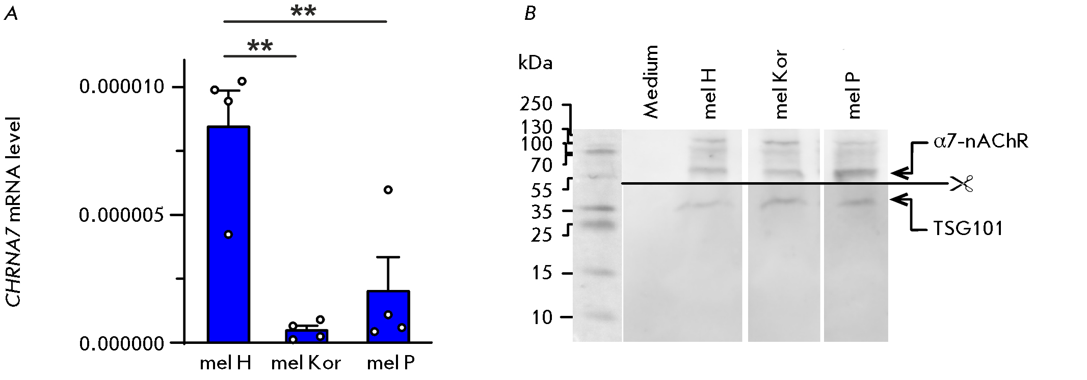 Рис. 1. Анализ экспрессии α7-nAChR в везикулах, секретируемых клетками метастатической меланомы. А – анализ экспрессии гена CHRNA7 в везикулах клеток линий mel H, mel Kor и mel P. Данные ПЦР в реальном времени нормированы на экспрессию мРНК S18 и приведены как среднее ± среднеквадратичная ошибка (n = 4). ** (p < 0.01) означает статистически значимое отличие групп данных согласно тесту Оne-way ANOVA/Tukey. Б – анализ содержания α7-nAChR в везикулах клеток mel H, mel Kor и mel P с помощью Вестерн-блотинга. Белок TSG101 использовали в качестве экзосомального маркера