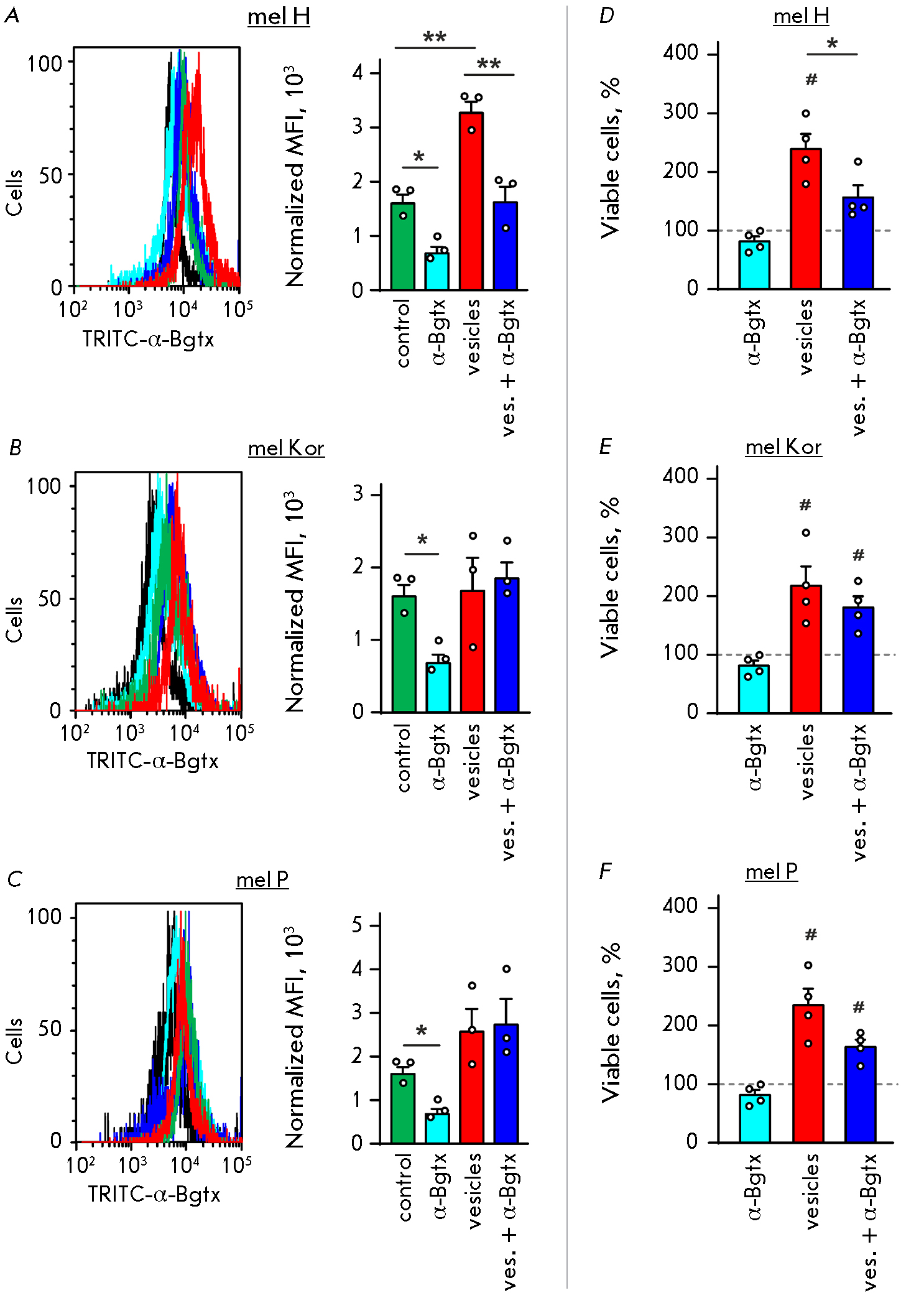 Влияние везикул и α-Bgtx на экспрессию α7-nAChR в кератиноцитах исследовали после окрашивания клеток TRITC-меченым α-Bgtx (Sigma-Aldrich, США) c помощью проточного цитофлуориметра Attune NxT (Life Technologies, США) как описано ранее [11]. Медиану флуоресценции нормировали на аутофлуоресценцию неокрашенных клеток.