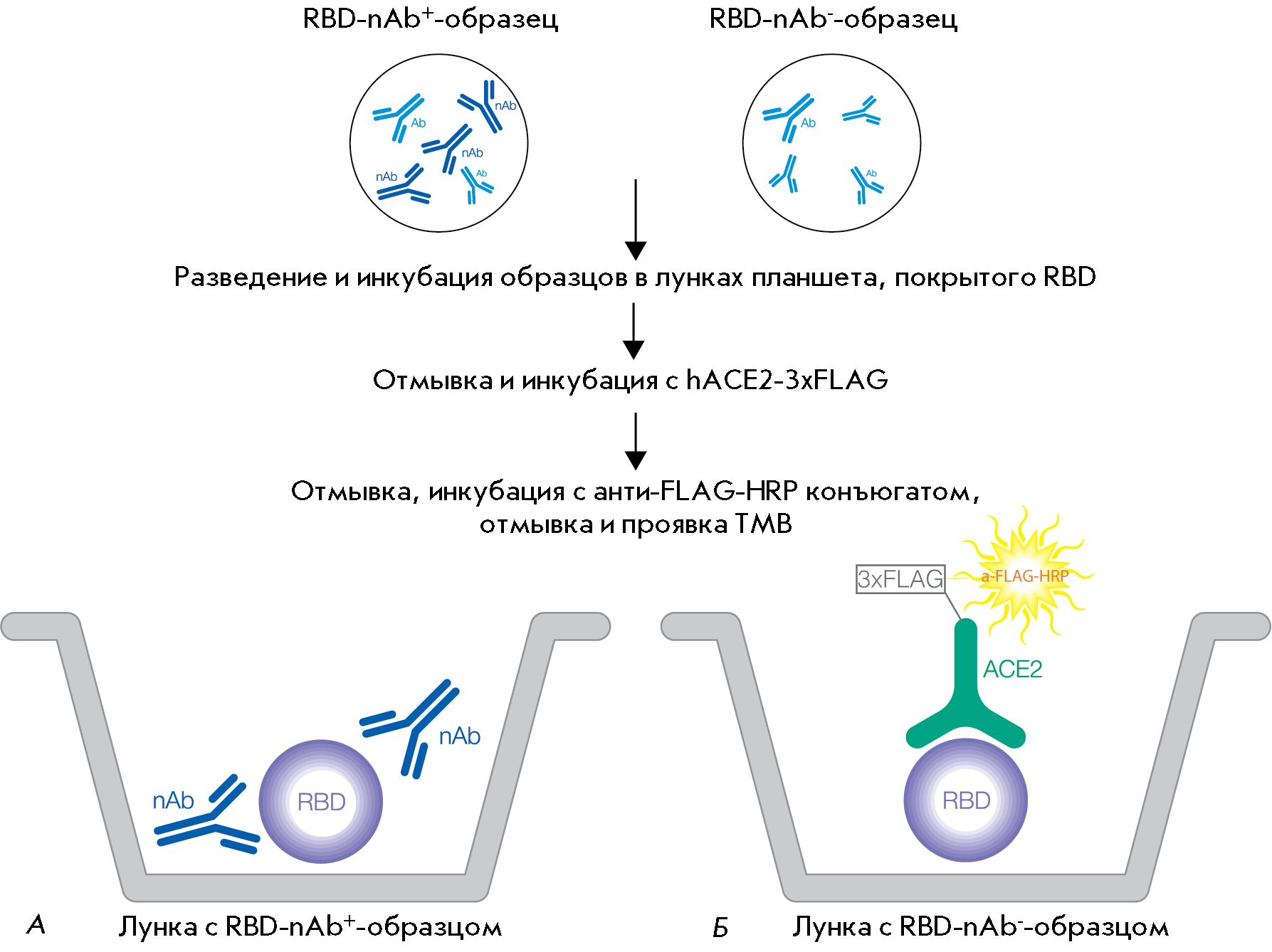 Fig. 1. Scheme of the quantitative determination of the activity of SARS-CoV-2 RBD-specific neutralizing antibodies in serum or plasma (sVNT). Antibodies in the serum sample interact with the recombinant RBD adsorbed in the wells. If the sample contains RBD-neutralizing antibodies (A), they block the binding of RBD to ACE2. If the sample does not contain neutralizing antibodies (B), the RBD adsorbed on the plate binds to recombinant ACE2. This binding is detected by peroxidase-labeled antibodies against the 3×FLAG sequence (3×FLAG) contained in recombinant ACE2. Therefore, the colorimetric signal recorded in the assay is inversely proportional to the concentration of the neutralizing antibodies in the sample. Designations: Ab – antibodies without neutralizing activity; ACE2 – recombinant human ACE2 receptor; HRP – antibodies to the FLAG epitope labeled with horseradish peroxidase; nAB – antibodies with RBD-neutralizing activity; RBD – the recombinant receptor-binding domain of the coronavirus SARS-CoV-2 S protein