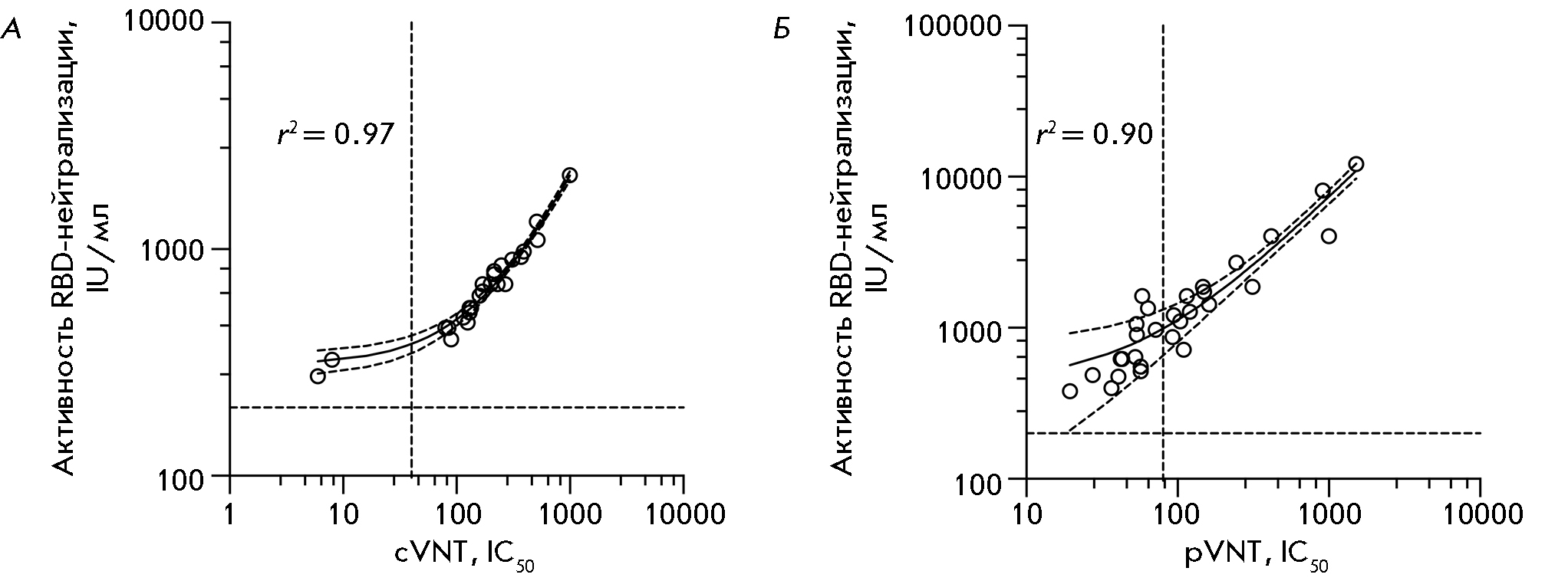 We have performed a successful validation of the designed competitive ELISA kit by comparing the RBD-neutralizing activity data to the virus neutralization data obtained using both standard testing with “live” viruses (cVNT) and testing with pseudoviruses (pVNT). The fidelity parameters of linear approximation (r2) were 0.97 and 0.90, respectively (Fig. 2).