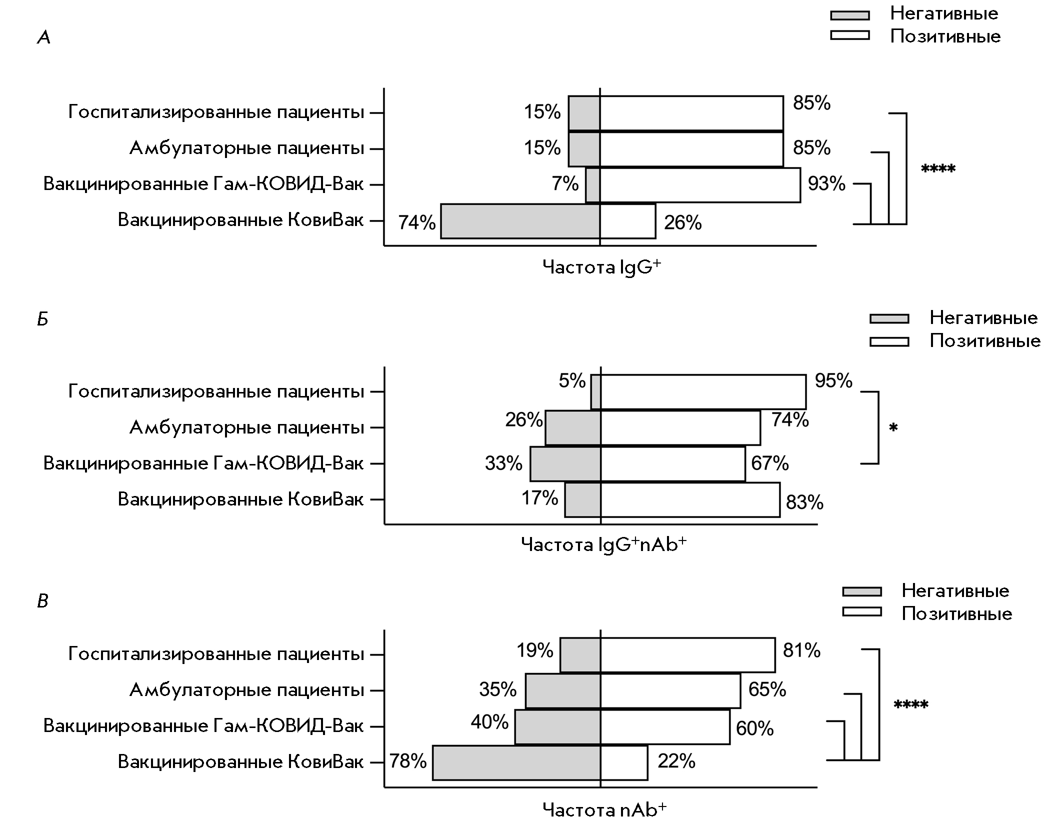 The frequency of occurrence of IgG-positive sera samples among the groups Hospitalized patients, Outpatients, and Vaccinated with Gam-COVID-Vac varied from 85 to 93%. In the group Vaccinated with CoviVac, the frequency of occurrence was as low as 26% (Fig. 3A). Among these IgG-seropositive sera samples, the frequency of occurrence of RBD-nAb-positive serum samples varied from 67 to 95% (Fig. 3B). The frequency of occurrence of RBD-nAb-positive serum samples in the group (showing the protective properties of the serum samples in the group) varied from 22 to 81% (Fig. 3C).
