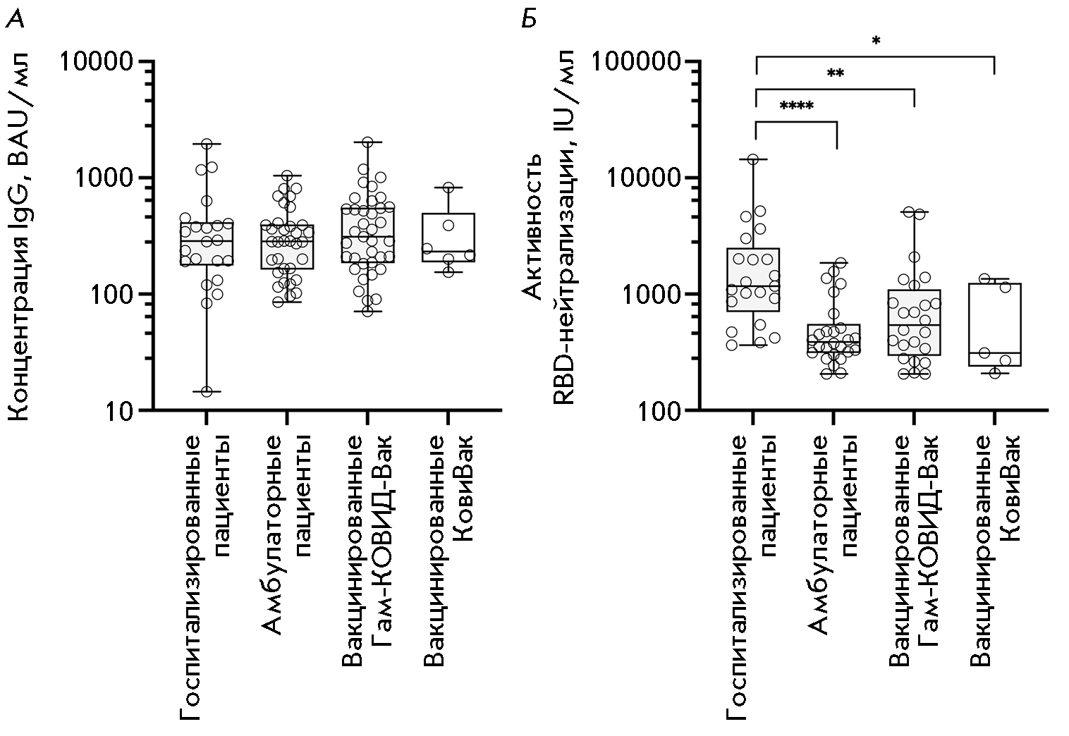 The concentrations of SARS-CoV-2 anti-RBD-IgG antibodies were almost identical for all the seropositive serum samples; however, the frequency of occurrence of IgG-positive sera in the group of individuals vaccinated with CoviVac based on the inactivated virus was more than threefold lower compared to the remaining groups. Earlier, we have demonstrated that most SARS-CoV-2 anti-RBD antibodies in patients who had had COVID-19 were conformationally dependent [16, 26]. CoviVac apparently has an appreciably low immunogenicity, which is probably caused by partial disruption of the structure of the S-protein epitopes during virus inactivation or storage. The frequency of occurrence of RBD-nAb-positive sera, as well as their activity, was highest in the group Hospitalized patients.