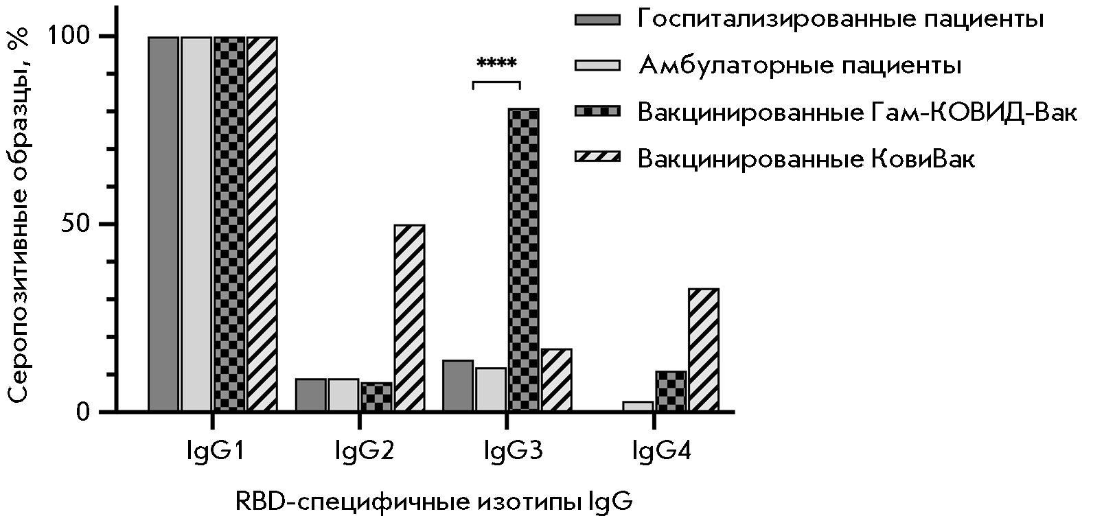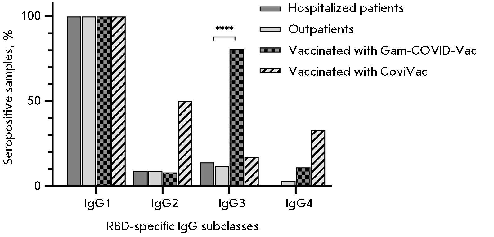 In order to further elucidate the nature of the humoral response, the double-positive (RBD-IgG+ and RBD-nAb+) samples were tested using subtype-specific conjugates. An analysis of IgG subclasses revealed an increased production of IgG3 antibodies in the group of individuals vaccinated with Gam-COVID-Vac, along with a switch to the IgG1 subclass in all the groups (Fig. 5).