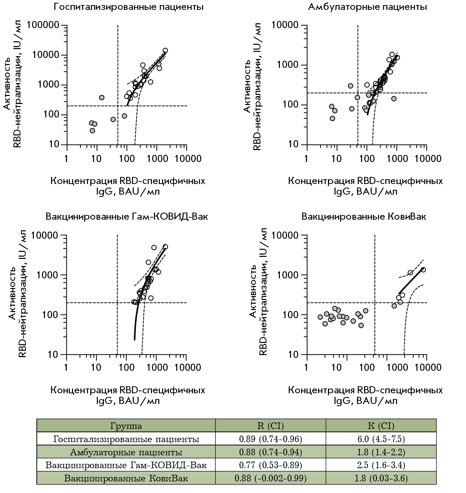 Fig. 6. Linear regression analysis of the serum antibody RBD-ACE2 neutralizing activity and RBD-specific IgG concentration. Double seropositive (RBD-IgG+ and RBD-nAb+) serum samples are shown as white circles; negative samples are shown as gray circles. The 95% confidence intervals and activity and concentration thresholds are shown with dotted lines. R is the Pearson correlation coefficient; K is the slope of the regression line; CI is the 95% confidence interval