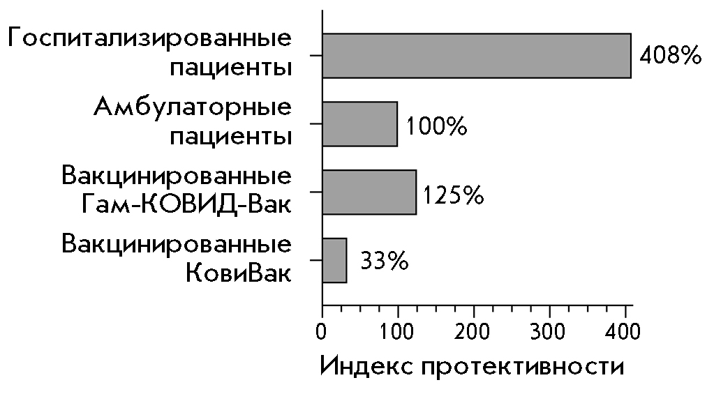 Fig. 7. The virus-neutralizing activity of the humoral immunity in the study groups. The protectivity index of the group Outpatients was taken as 100%