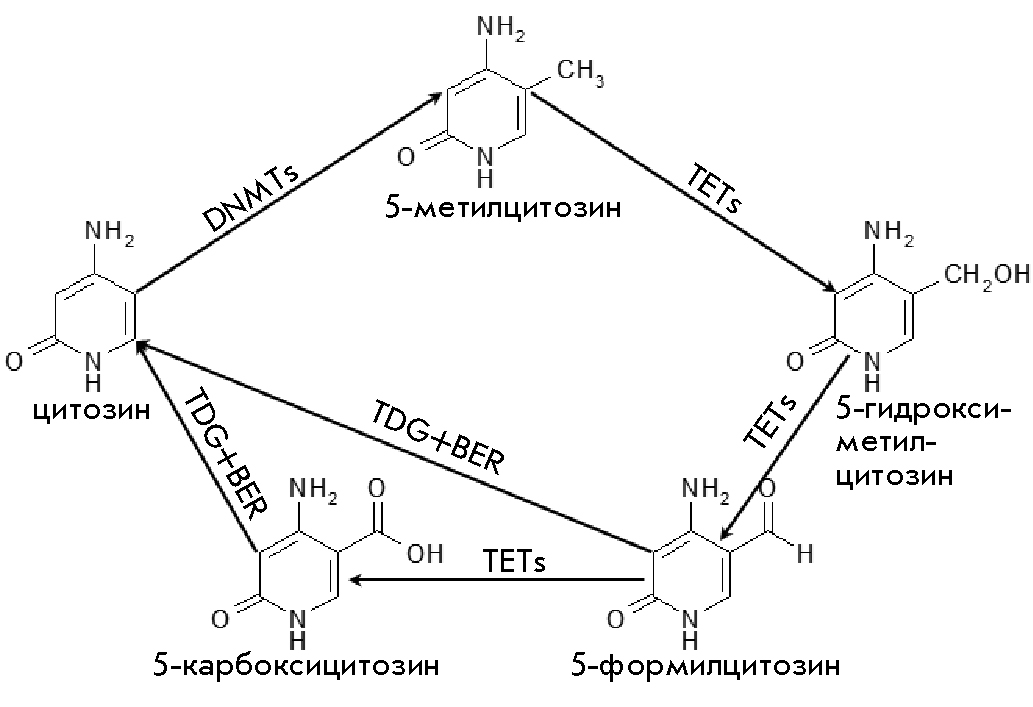 Cytosine is referred to as the fifth DNA base, and cytosine residue methylation is the most common DNA modification in mammalian cells. Cytosine residues in CpG dinucleotides are most often subject to methylation. However, the methylated cytosines outside CpG dinucleotides may account for 25–50% of all mC in stem cells and neurons [1]. In mammals, about 70–80% of cytosines in CpG dinucleotides are methylated [2]. De novo DNA methylation is catalyzed by the DNMT3a/3b DNA methylatransferases responsible for methylation in different genome regions and that are not interchangeable [3, 4]. DNA methylation during replication is maintained by DNMT1 DNA methyltransferase. DNA demethylation occurs both passively, during cell division, and actively, due to enzyme activity. The key factors involved in active demethylation are TET1,2,3 dioxygenases. TET proteins oxidize methylcytosine to hydroxymethylcytosine and, then, formylcytosine and carboxycytosine, which then produce cytosine as a result of excision repair by thymine-DNA glycosylase (TDG/NEIL) (Fig. 1) [5]. Methylcytosine derivatives are not only considered as intermediate states between methylated and non-methylated bases, but also as DNA modifications affecting the binding of transcription factors, as they are involved in gene expression regulation (Methylcytosine derivatives are discussed in survey [6]).