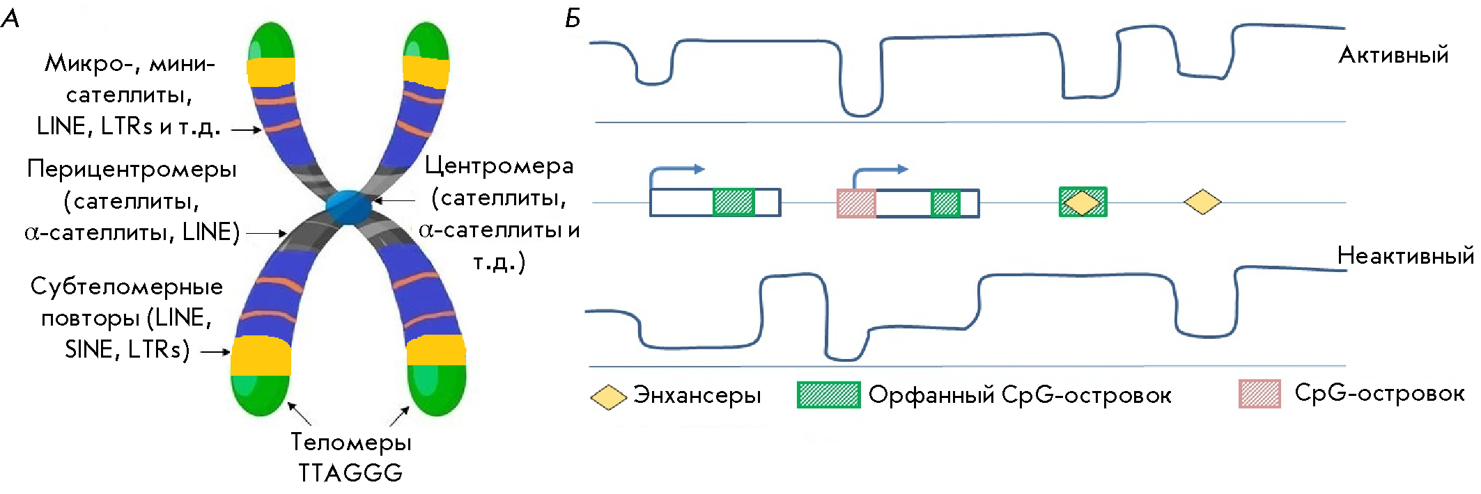 Fig. 2. Landscape of the DNA repetitive sequences. (A) Location of various repeating sequences on a chromosome. (B) DNA methylation profile in the genome, depending on the activity of promoters and enhancers and the presence of CpG islands