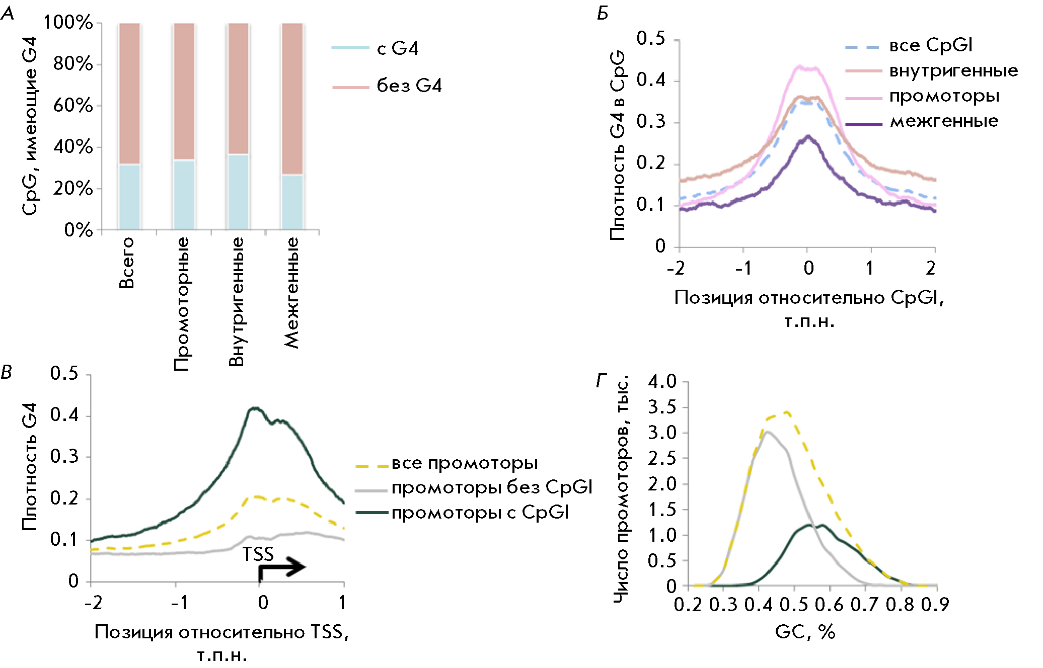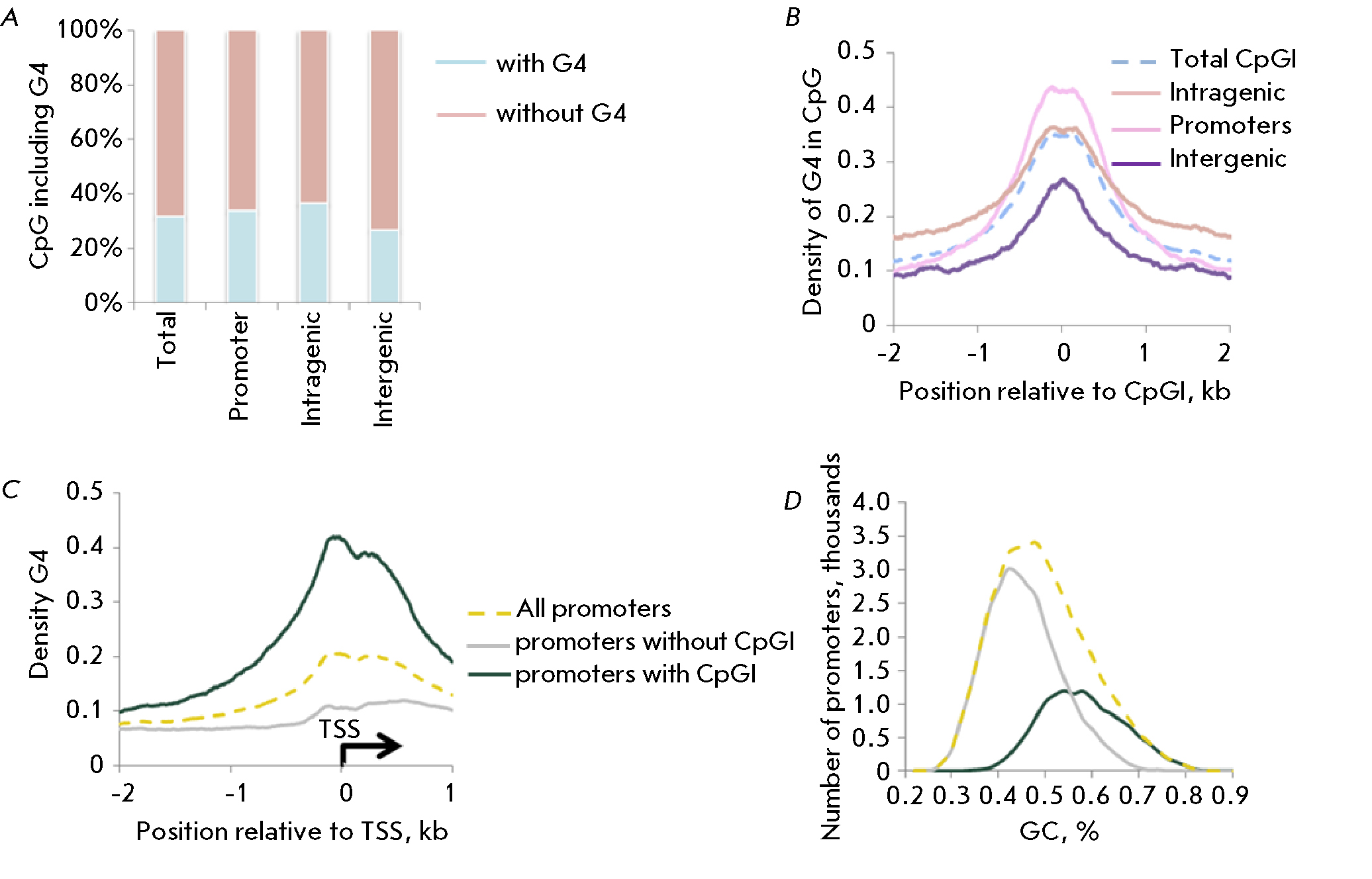 5. Fig. 4. Distribution of potential G4 sequences in CpG islands. (A) The proportion of CpG islands with G4, (B) the distribution density of G4 near CpG islands depending on the localization in the genome. (C) G4 density and (D) GC composition in promoter regions depending on the presence of CpG islands