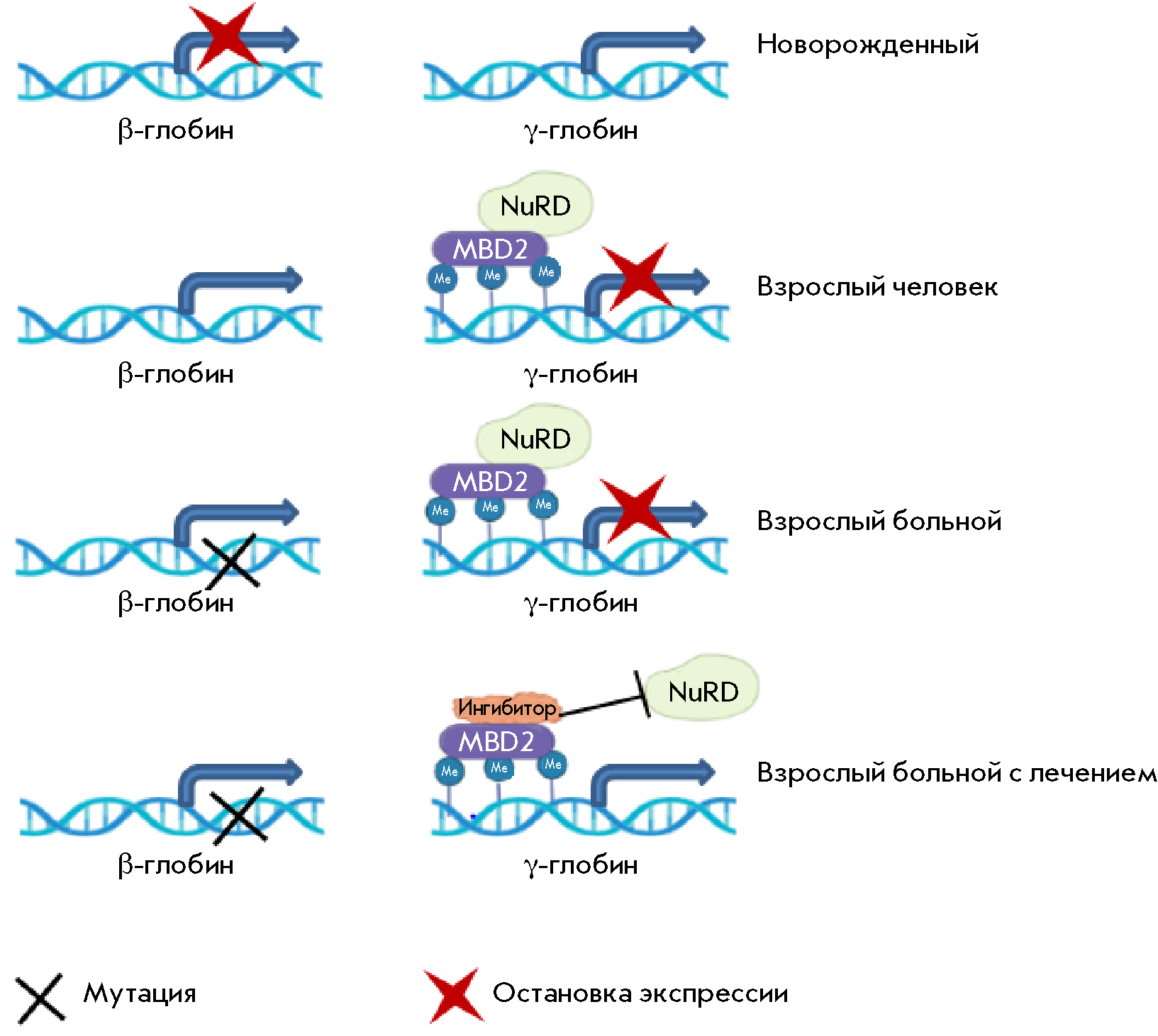 6. Fig. 5. Model of the functional significance of the interaction between the MBD2 protein and the NuRD repression complex in the regulation of the gamma globin gene in beta-telassemia [122, 123]