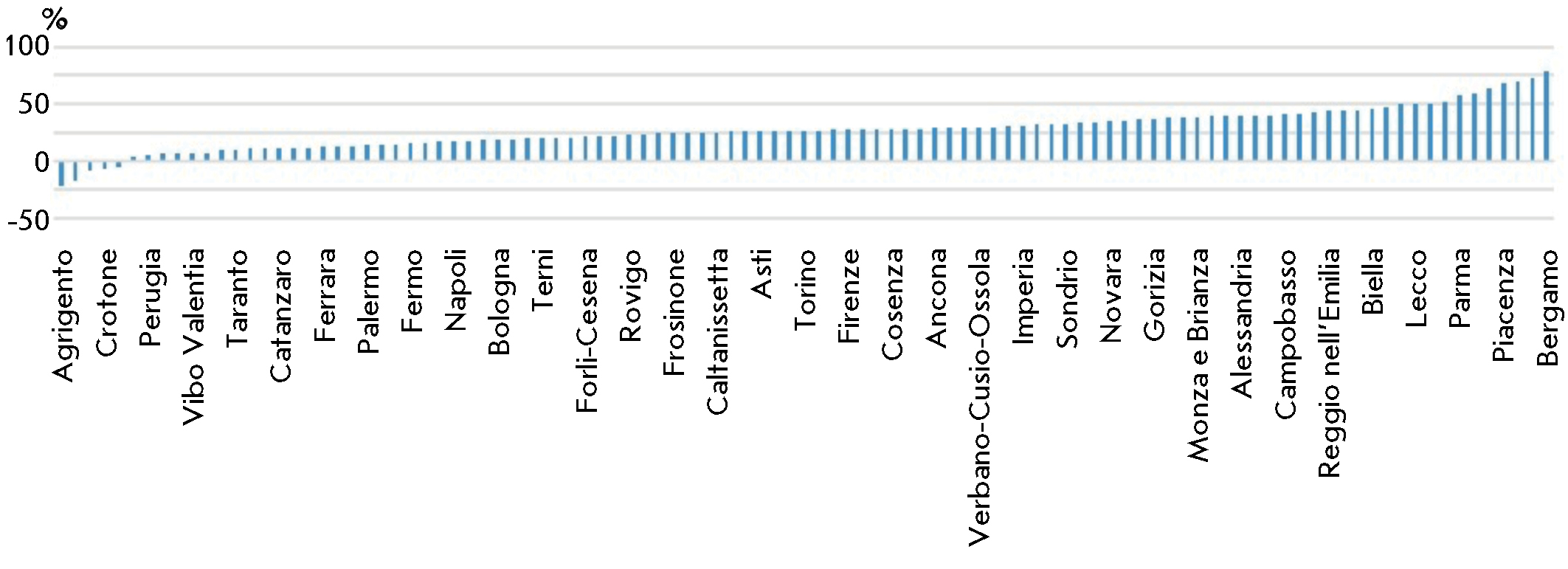 Fig. 3. Percentage of variation of deaths across the provinces of Italy in the period under consideration (February 15 – April 15) – We present the extremes; the details are in Table 1