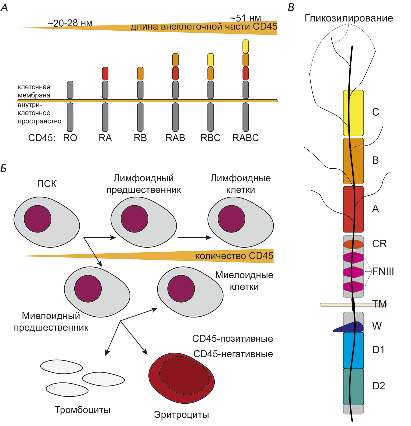 Fig. 1. The structure and prevalence of CD45 isoforms in blood cells. (A) Six main CD45 isoforms found in humans differ in the composition of their extracellular part owing to the alternative splicing of pre-mRNA of the PTPRC gene; (B) CD45 resides on the membrane of all cells of hematopoietic origin except for platelets and erythrocytes. The amount of CD45 increases during cell differentiation; (C) the structure of CD45RABC. PSC – pluripotent stem cell; A, B, C – the extracellular domains of CD45 responsible for a particular isoform; CR – cysteine-rich region; FNIII – fibronectin type III domains; TM – transmembrane domain; W – wedge domain; D1 – domain with phosphatase activity; D2 – domain required for CD45 to function in the cell