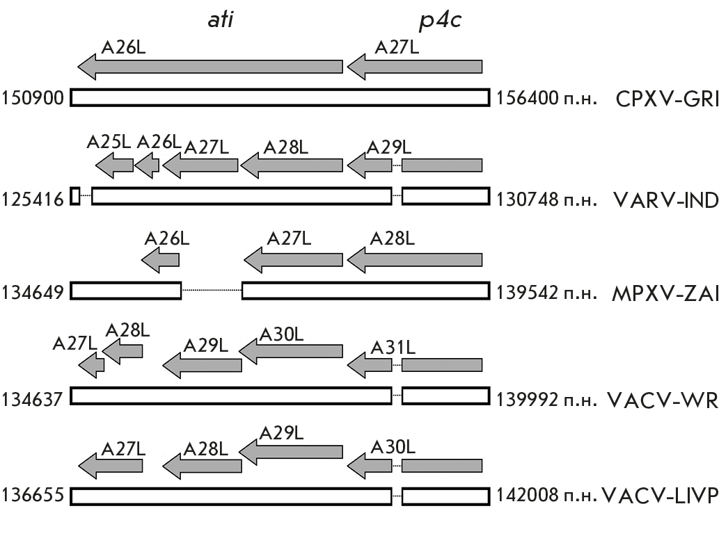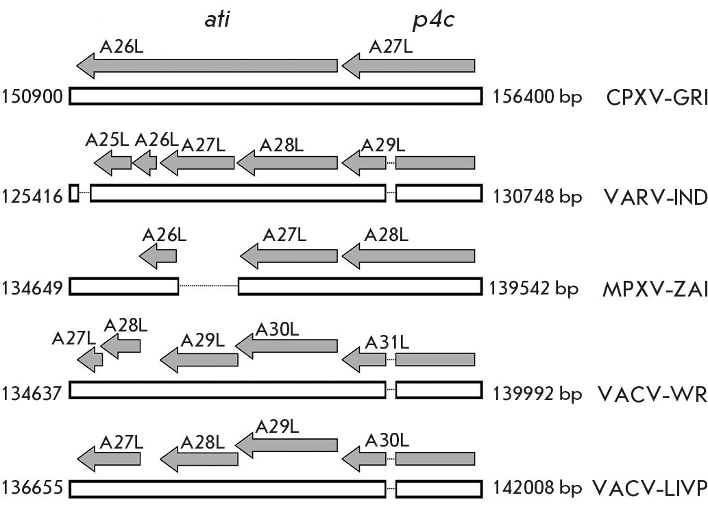 Fig. 1. Comparison of the potential orthopoxvirus open reading frames (ORFs) within the ati (ORF A26L) and p4c ((A27L) CPXV-GRI) genes. Gray arrows indicate the size and direction of the respective ORFs; their names are provided above these arrows for the CPXV-GRI, VARV-IND, MPXV-ZAI, VACV-WR [2], and VACV-LIVP viruses. Numbers to the right and left of white boxes denote the positions of the respective regions of the viral genomes. Thin lines indicate deletions in the viral genomes with respect to the CPXV-GRI DNA sequence. The truncated form of the ATI protein is encoded by ORF A29L VACV-LIVP and the respective ORFs of other viruses