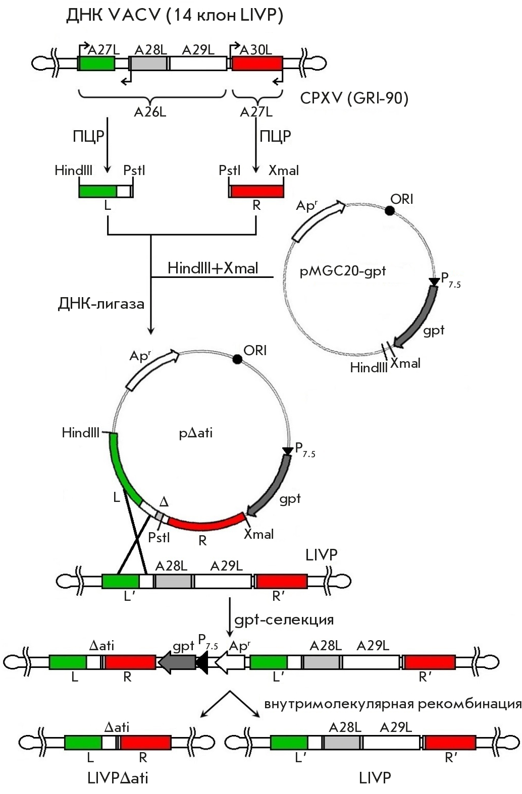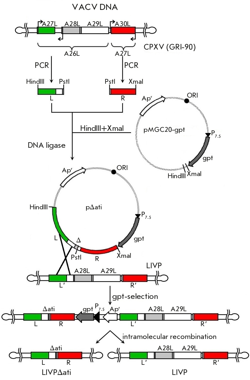 Fig. 2. Scheme for constructing the plasmid p∆ati and VACV LIVPΔati (see explanation in the text). L and R – left and right flanking ati gene regions