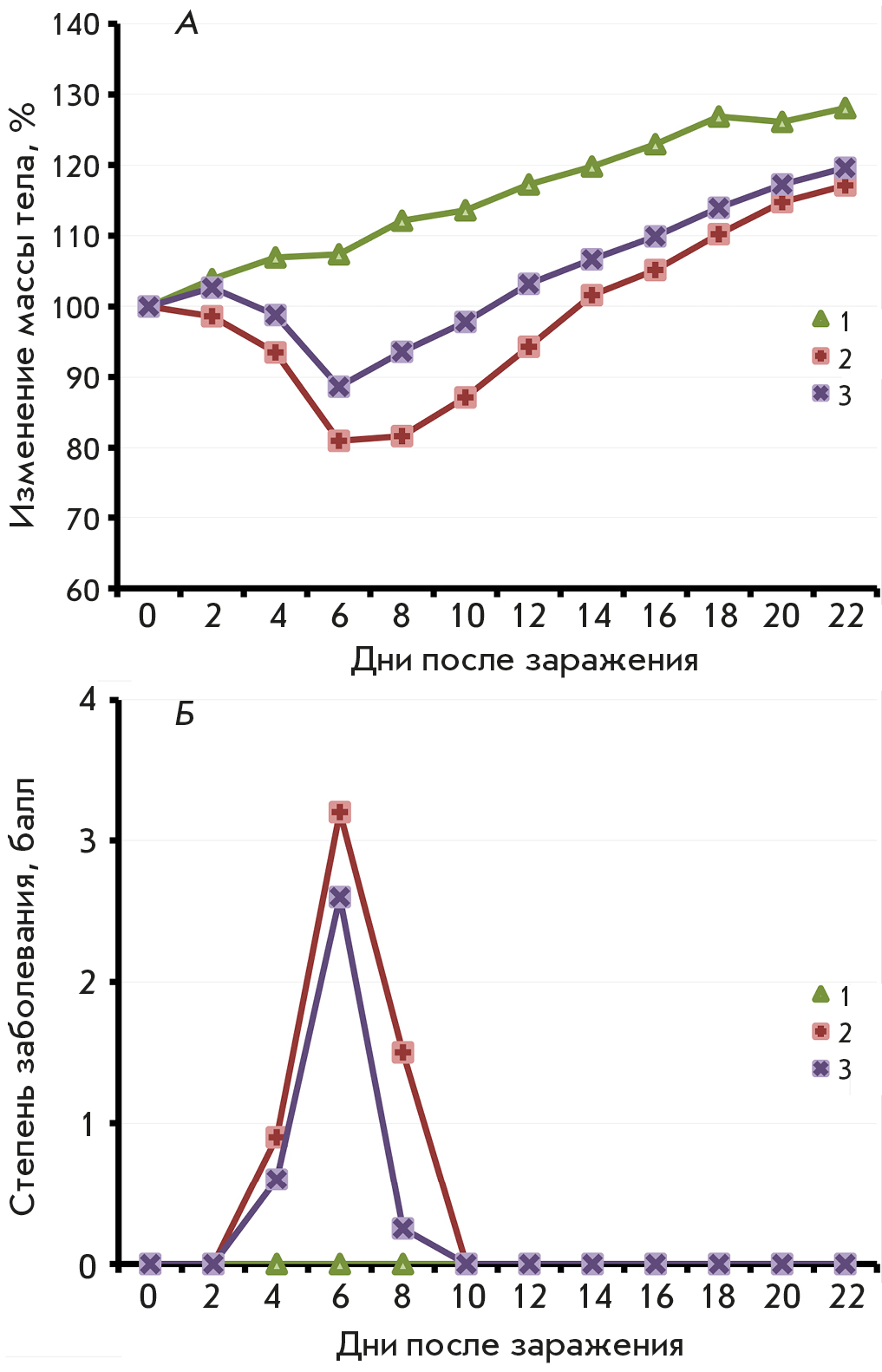 Fig. 3. The dynamics of changes in mouse body weight (A) and clinical manifestations of the infection (B) after i.n. inoculation of the LIVP (2) or LIVPΔati (3) viruses at a dose of 107 pfu. Data for groups consisting of 10 animals infected with the respective viruses, as well as the control group (1), are presented