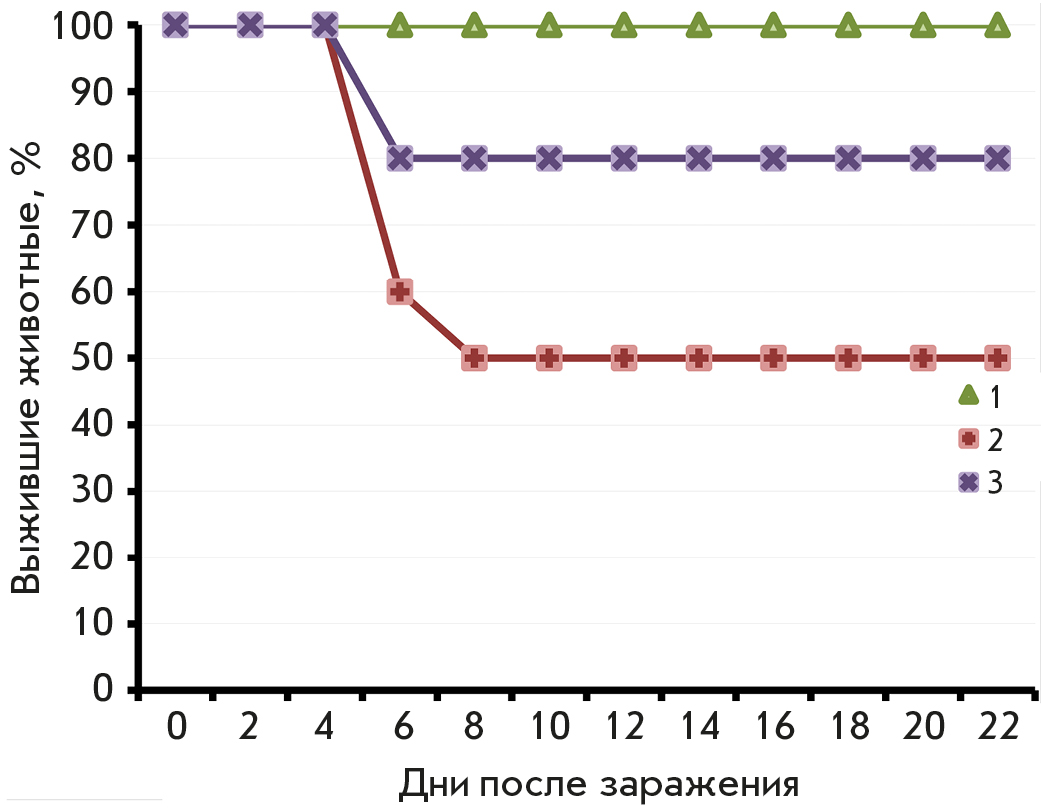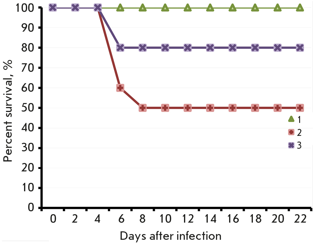Fig. 4. The dynamics of death of mice i.n. infected with the LIVP (2) or LIVPΔati (3) viruses at a dose of 107 pfu. Control group – non-infected animals (1)
