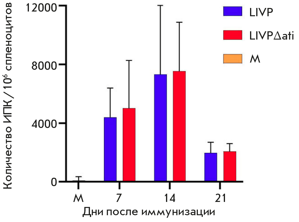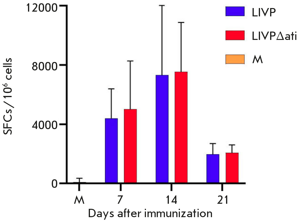 Comparison of the dynamics of emergence of a humoral immune response to the vaccination of mice with the LIVP and LIVP∆ati viruses