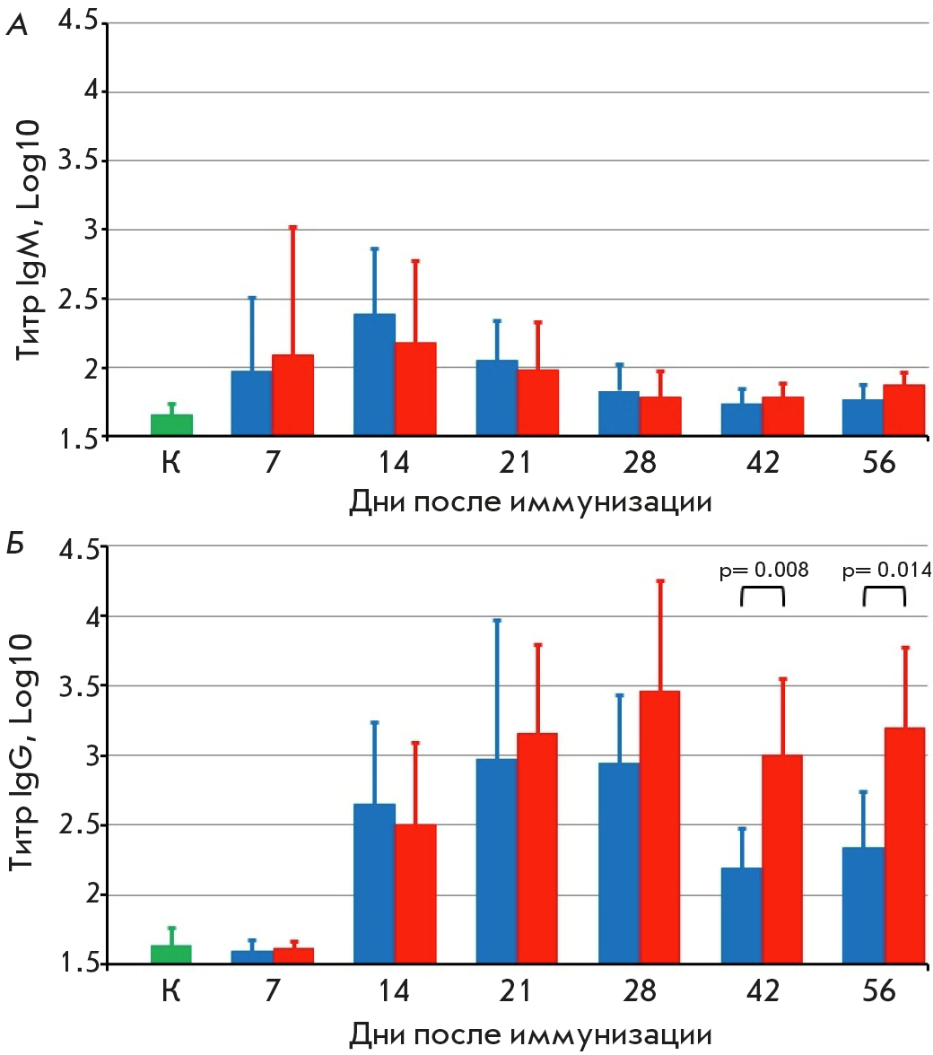 The humoral immune response in the mice was analyzed on days 7, 14, 21, 28, 42, and 56 post immunization (dpi). At each time point specified above, six mice per group were taken for analysis. Mouse blood samples were intravitally collected from the retro-orbital venous sinus using a 23G needle. Blood sampling from the retro-orbital sinus does not cause visual organ injury. Blood sampling is a short-lasting but painful procedure; however, no analgesia was used, as it has been demonstrated that the known analgesic or anesthetic techniques may affect the immunological parameters of the animal’s blood.
