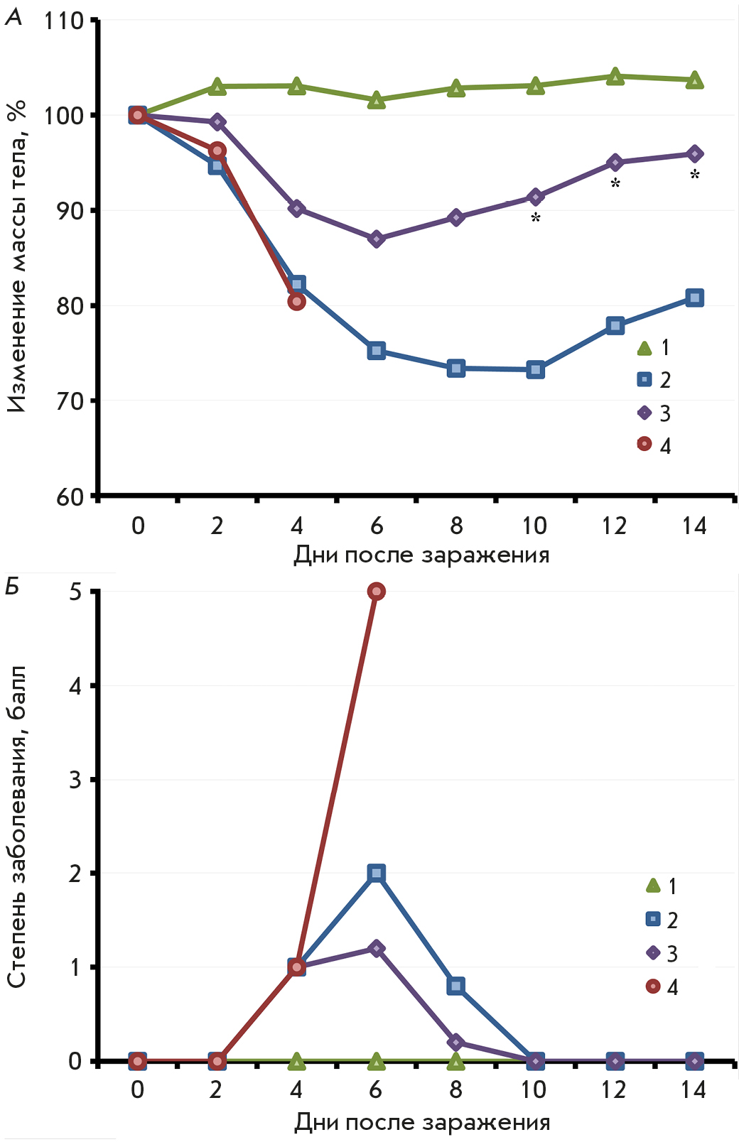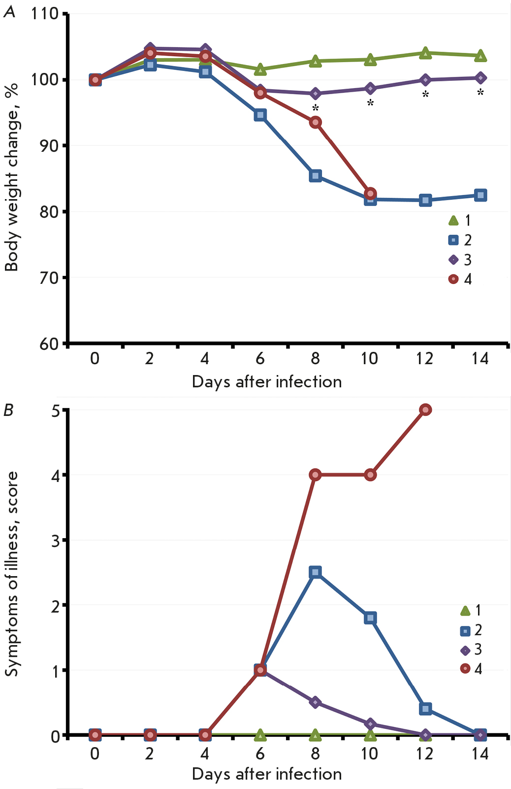 Fig. 7. The dynamics of changes in body weight (A) and clinical manifestations of the infection (B) after i.n. infection of mice vaccinated with LIVP (2) or LIVP∆ati (3) with CPXV-GRI on day 60 post-immunization. The data are presented for groups consisting of six animals. The controls were groups of non-vaccinated mice, both non-infected (1) and infected with CPXV-GRI (4). An asterisk shows the time points at which the mean body weights (expressed as a percentage of the initial weight) in the group of mice immunized with LIVP∆ati differ statistically significantly from those in the group of mice immunized with LIVP. Comparison was performed using the Student’s t-test for independent samples