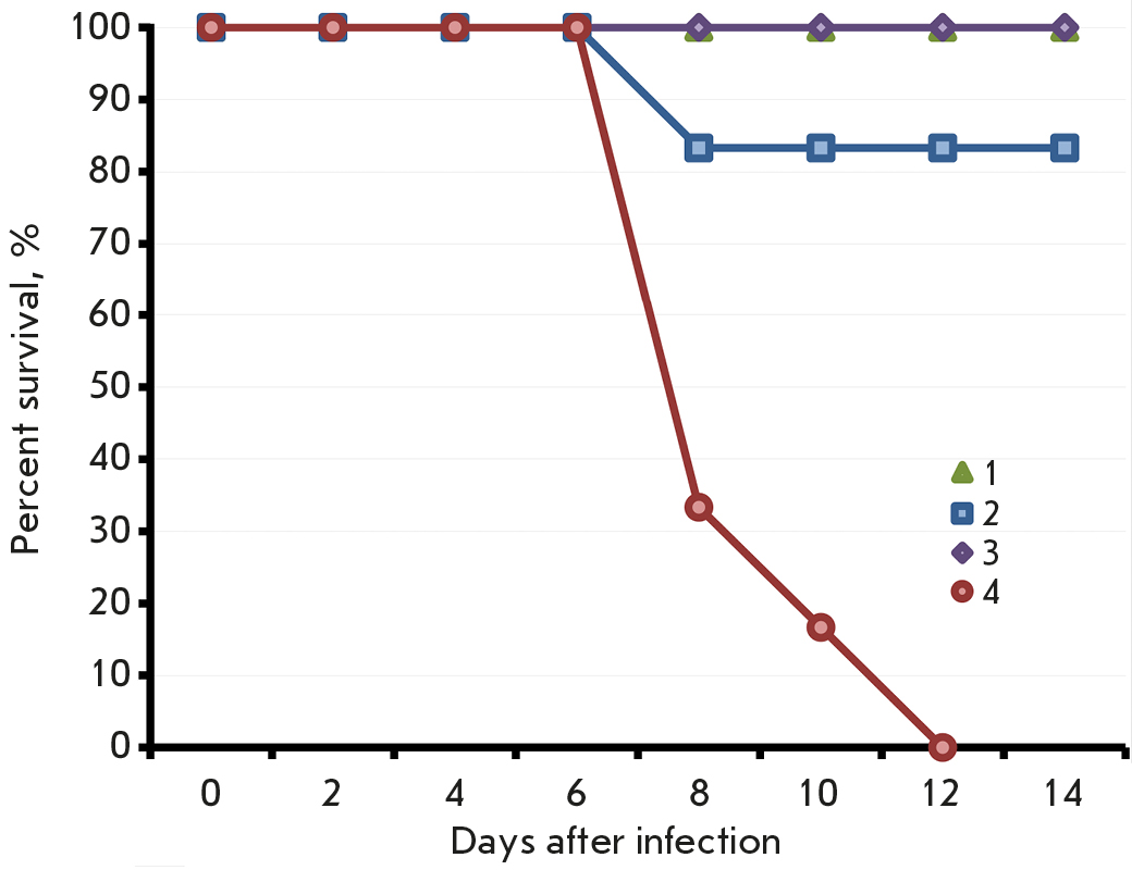 Fig. 8. The dynamics of deaths of mice vaccinated with LIVP (2) or LIVP∆ati (3) after i.n. infection with ECTV-K1 on day 60 post immunization. The data are presented for groups consisting of six animals. The controls were groups of non-vaccinated mice, both non-infected (1) and infected with CPXV-ECTV-K1 (4)