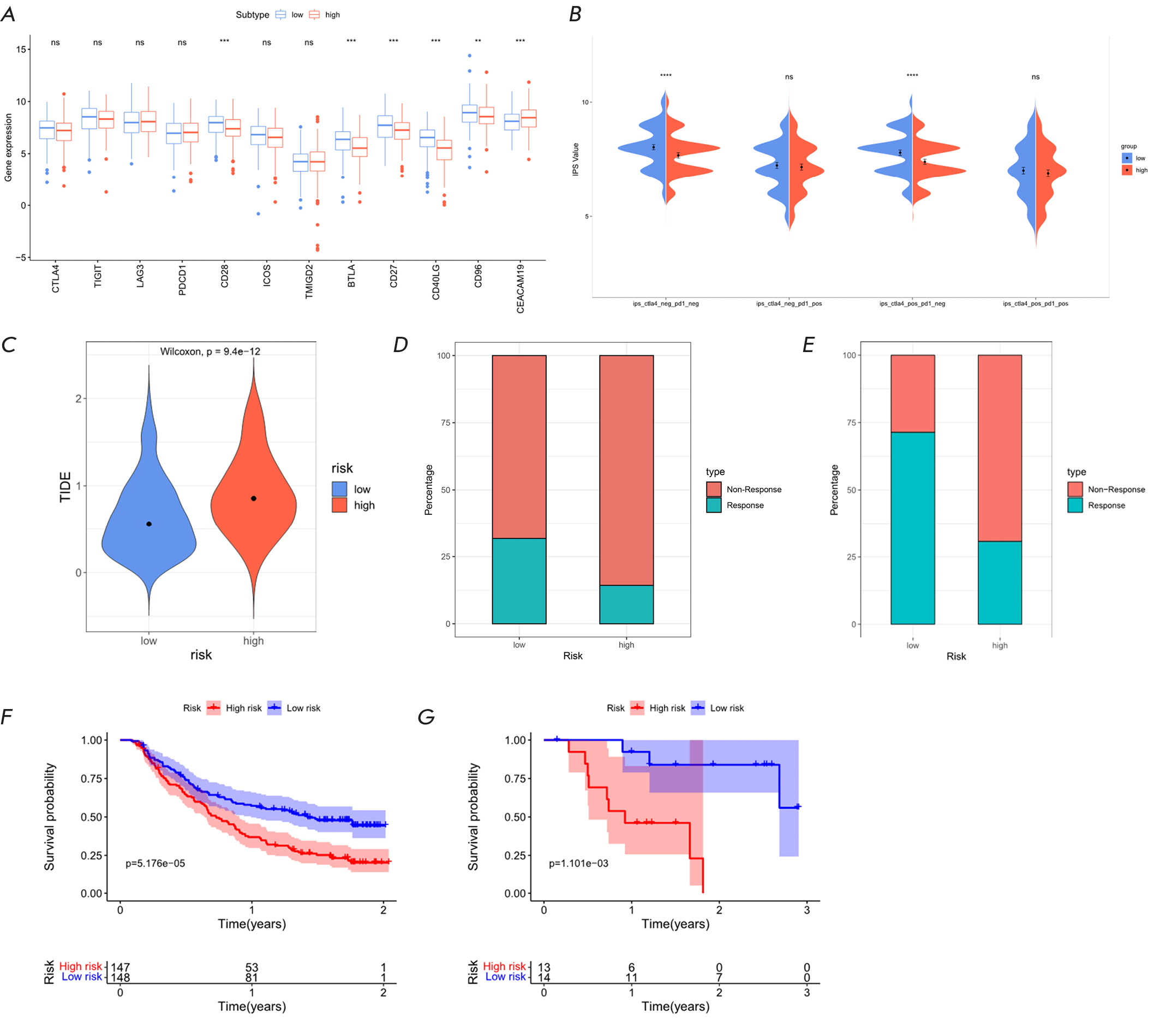 The Riskscore of LUAD individuals is tightly linked to their immune function, suggesting that the HR and LR groups may have different responses to immunotherapy. Therefore, we further explored the ability of the prognostic model to predict the immunotherapy response of cancer individuals. Expression of most immune checkpoints was notably higher in the LR group, with significant differences (P < 0.05) (Fig. 6A). The IPS score indicated that individuals in the LR group exhibited a better response to CTLA-4 and anti-PD-1 treatment, denoting that LR LUAD individuals had stronger immunogenicity and were more likely to benefit from immune therapy (P < 0.05) (Fig. 6B). LR LUAD individuals with lower TIDE scores indicated a weaker inclination to evade the immune system and a stronger inclination to benefit from immune therapy, with significant differences (P < 0.05) (Fig. 6C). Since there is currently no transcriptome data on the response of LUAD individuals to ICI treatment, we used other cancer data to ascertain the performance of the model in predicting the immunotherapy response. Using the IMvigor210 and GSE78220 datasets to verify the response of the HR and LR groups, we found that the samples responsive to immunotherapy in the LR group were higher than those in the HR group (Fig. 6D–E), and that OS of the LR group was tellingly better than that of the HR group, showing a better survival trend (Fig. 6F–G). In summary, LR LUAD patients displayed a greater likelihood of responding to immunotherapy than HR patients and had a better prognosis.