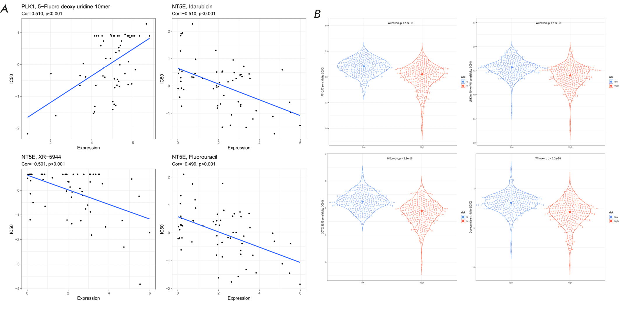 To mine the response of LUAD patients to anti-cancer drug treatment, we dissected the linkage between the expression of prognostic feature genes and the IC50 values of drug antagonists, with results displaying a significant positive linkage between the expression of the PLK1 and IC50 value of 5-Fluoro deoxy uridine 10mer (cor = 0.510), while the expression level of NT5E showed a significant negative linkage with the IC50 values of Idarubicin (cor = -0.510), XR-5944 (cor = -0.501), and Fluorouracil (cor = -0.499) (Fig. 7A). Furthermore, we investigated the association between the prognostic risk and drug sensitivity. The findings revealed that the HR group, characterized by a poor OS, exhibited heightened sensitivity to the drugs FTI-277, JNK Inhibitor VIII, CCT018159, and Docetaxel (P < 0.001) (Fig. 7B).