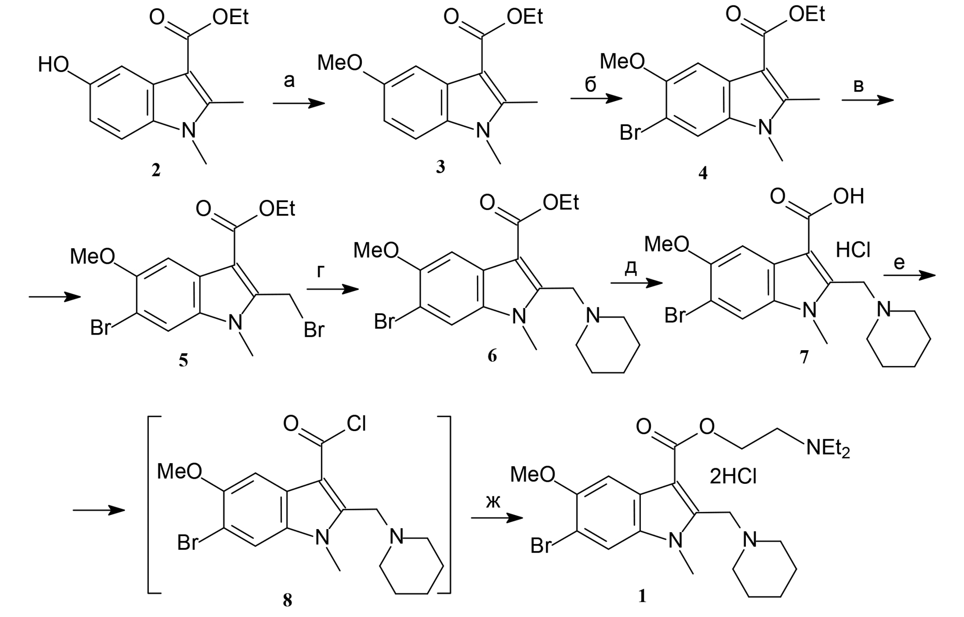 The study compound, dihydrochloride of 6-bromo-5-methoxy-1-methyl-2-(1-piperidinomethyl)-3-(2-diethylaminoethoxy)carbonylindole (1) (Fig. 1), was synthesized [7] at the National Medical Research Center for Radiology of the Ministry of Health of the Russian Federation.