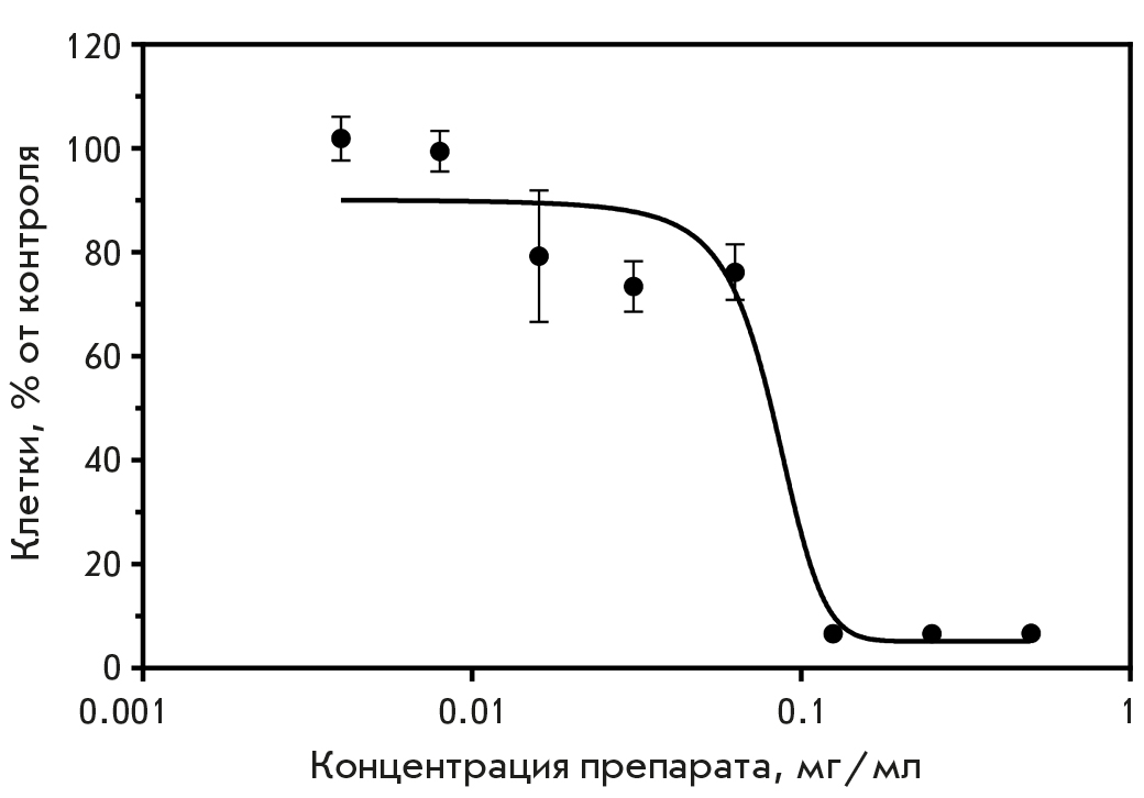 Fig. 6. Determining the cytotoxic effect of compound 1 96 h after its addition to the Vero E6 cell culture (using MTS vital dye). СС50 = 83.32 µg/mL