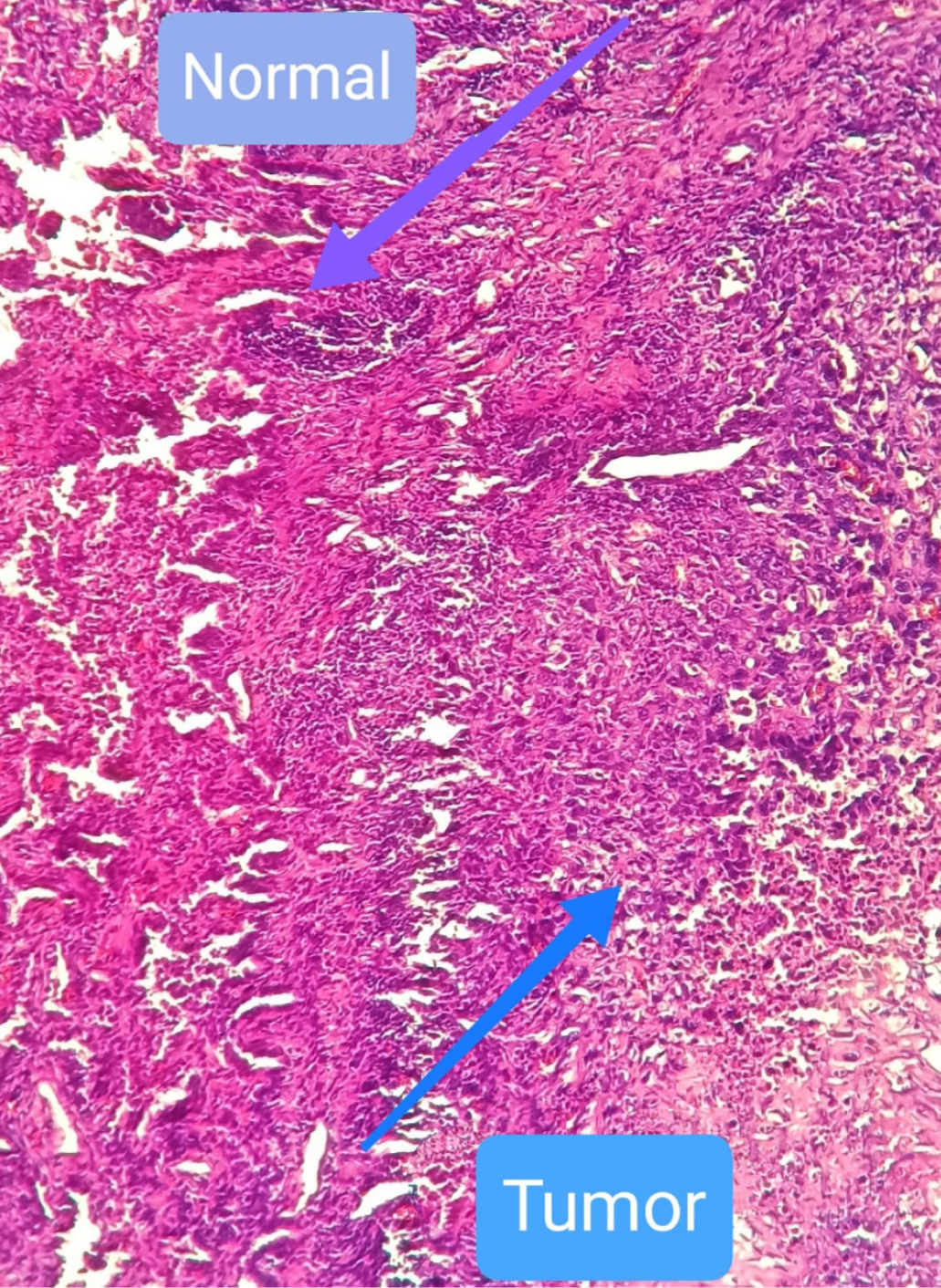 Human lung tissues were collected immediately after the surgery on lung carcinoma patients in accordance with the tenets of the Declaration of Helsinki and approved by the review board of the Azerbaijan National Center of Oncology. Informed consent was obtained from each donor. Lung carcinoma patients were selected after computed tomography. The cancer diagnosis for individuals was confirmed after biopsy and subsequent histopathological grade (aggressiveness) evaluations. Experiments were performed on five individuals. However, due to similar findings, here we report, as an example, a case of a 52-year-old male who did not receive chemo- or radiation therapy before the surgery. The results for this case were more characteristic and, therefore, analyzed thoroughly. The pathology findings on the surgical lung tissue were consistent with Stage II, pT2bN0Mx, non-small cell lung cancer. Bulk lung tissue was segregated into cancer (carcinoma) and neighboring normal (also referred to as healthy) tissues by the pathologist. Normal and cancer cells in the investigated lung tissue are indicated in Fig. 1. Experiments with spin-labeled lauric acid (C12SL) were performed with the surgical tissue of the patient with the following pathology findings: 53-years-old male, lung adenocarcinoma, Stage II, pT3N0Mx.ICD-O: 8260/3, invasive.