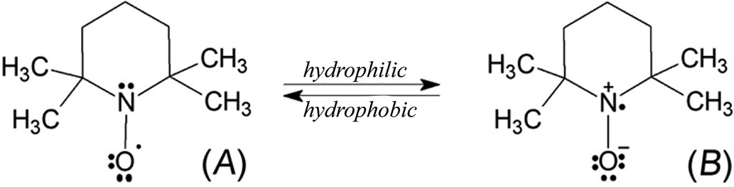 Polar solvents like the aqueous solution tend to stabilize the structure (B) in which the unpaired electron density is localized on the N-atom. The increased relative contribution of structure (B) gives rise to the nitrogen hyperfine coupling constant. In contrast, structure (A), in which the unpaired electron density is localized on the oxygen atom, is preferentially stabilized in a hydrophobic environment. Therefore, the nitrogen hyperfine coupling constant is lower in a hydrophobic environment compared to that of a hydrophilic environment.