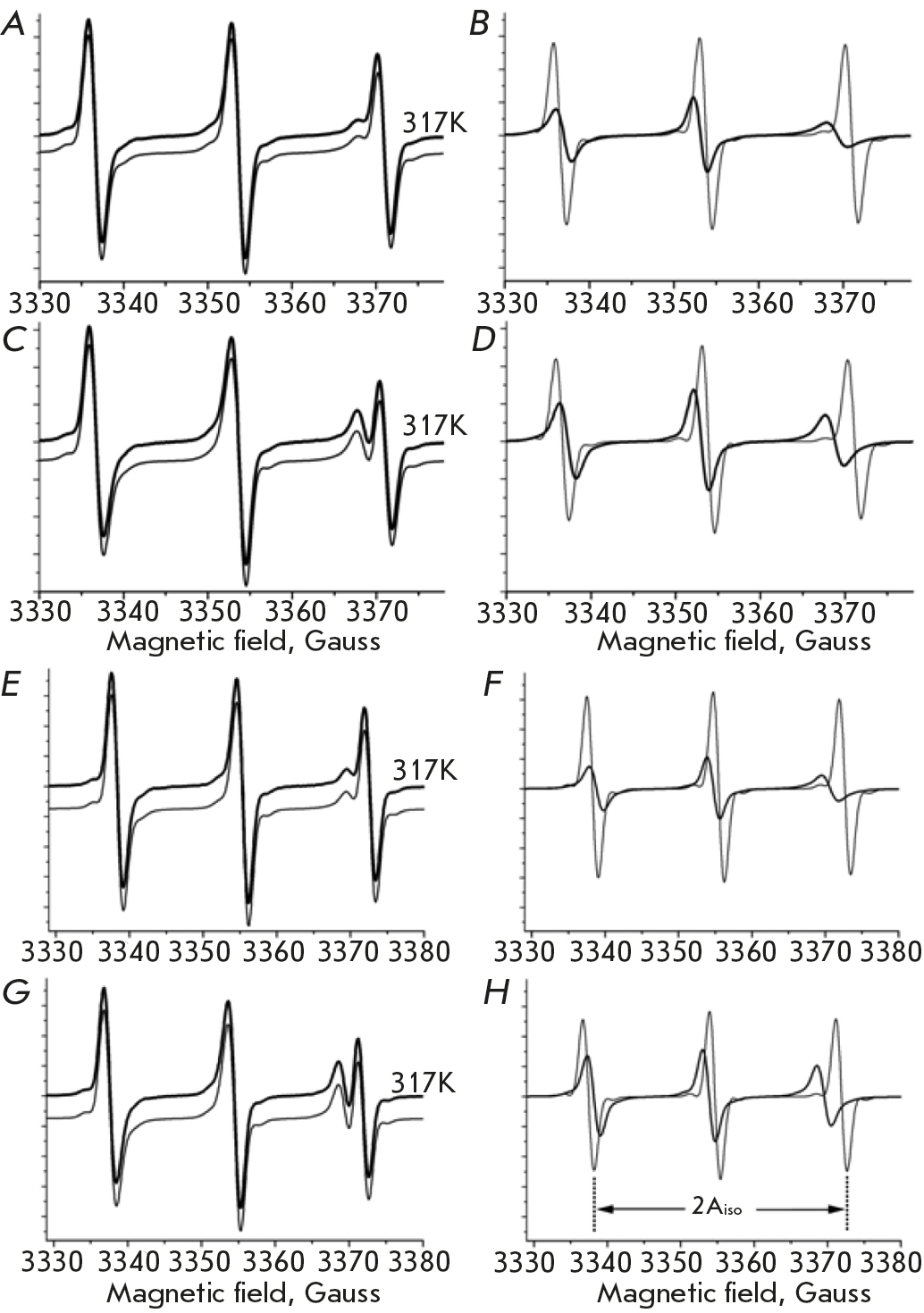 Decompositions of the EPR spectra of TEMPO incubated with cancer and healthy cells of the human lung at 317K using the two-component model, as an example, are shown in Fig. 3. The composite EPR spectra simulated from the resolved parameters are indistinguishable from the experimental spectra (Fig. 3A,C,E,G). Therefore, the simulated composite EPR spectra are vertically shifted for easy visualization. The EPR spectra of the resolved components (Fig. 3B,D,F,H) are in full agreement with the above-mentioned suggestion. Indeed, a mismatch in the positions of the EPR components (g values) and nitrogen hyperfine coupling constant (2Aiso, Fig. 3H) is evident. In all evaluated samples, the EPR spectra of TEMPO in the aqueous environments (thin lines in Figs. 3B,D,F,H representing healthy and cancer cells at pH values of 7.3 and 6.2) show identical 2Aiso values of 34.5 Gauss (Table 1).