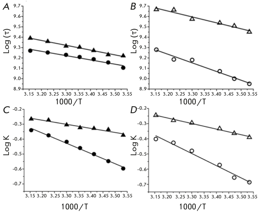 Fig. 4. Arrhenius plots for the parameters obtained from the EPR spectra of TEMPO partitioning in the healthy and carcinoma cells of the human lung tissue. Arrhenius plots for the rotational correlation times of TEMPO in the membrane environments of the cells at pH 7.3 (A) and 6.2 (B). Solid circles and solid triangles in (A) represent healthy and carcinoma cells, respectively. Open circles and triangles in (B) represent healthy and carcinoma cells, respectively. Arrhenius plots for the TEMPO partitioning coefficients in the healthy and carcinoma lung cells at pH values of 7.3 (C) and 6.2 (D). The definitions of symbols in (C) and (D) are the same as in (A) and (B), respectively. K and τ are the partition coefficient and rotational correlation time, respectively