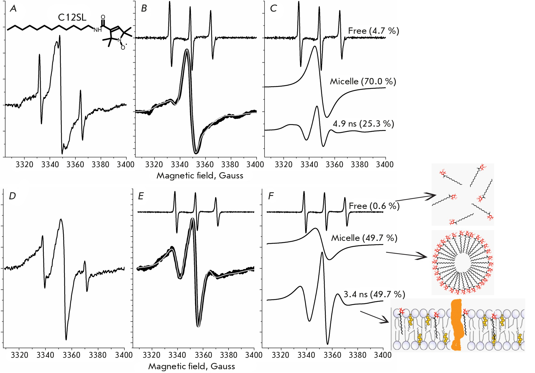 Fig. 5. EPR spectra of C12SL incorporated into the lipid domain of the membranes of healthy and cancer cells of the human lung. (A), (B), and (C) are the EPR spectrum of C12SL (shown in (A)) incubated with the cell suspension of healthy lung tissue, separation of free and composite spectral components, and the spectral component of the EPR spectrum, respectively. The grey line (in (B)) is a computer-simulated spectrum from the best fit parameters of a two-component model. (D), (E), and (F) are the same as in (A), (B), and (C), but they were obtained from the cell suspension of lung cancer cells. The EPR spectra of C12SL were measured at room temperature. The schema provided in the bottom-right corner of the Figure illustrates C12SL in “free”, “micelle” and “membrane-incorporated” situations. C12SL is a spin-labeled analog of lauric acid, the chemical structure of which is shown in Fig. 5A