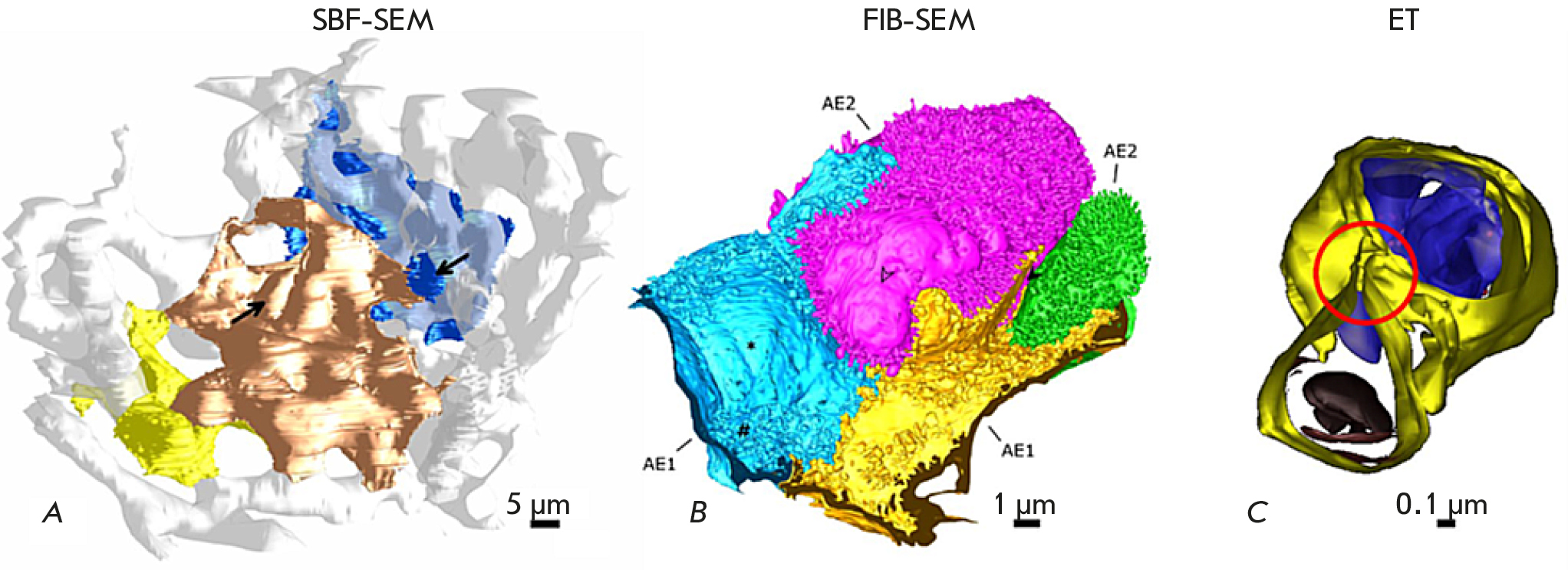 Fig. 5. 3D reconstructions obtained using serial block-face scanning electron microscopy (SBF-SEM), SEM with layer-by-layer etching with a focused ion beam (FIB-SEM), and electron tomography (ET). (A) 3D reconstruction of human alveolar epithelial type 1 cells (AE1) (yellow, gold, and blue) and the alveolar capillary network (white) based on the SBF-SEM dataset. Arrows indicate the position of the nuclei of AE1 cells. (B) 3D reconstruction of virtually the entire human alveolar epithelial type 2 (AE2) cell (pink) with portions of adjacent AE1 cell domains (blue and yellow) and an additional AE2 cell (green) based on the FIB-SEM dataset. (C) 3D reconstruction of the lamellar body (top) and the autophagosome (bottom) inside an AE2 cell (mouse lung) based on the ET dataset. Separate lipid membranes are distinguishable, which in this case is indicative of a connection of two organelles (a red circle). The figure was taken from ref. [6]