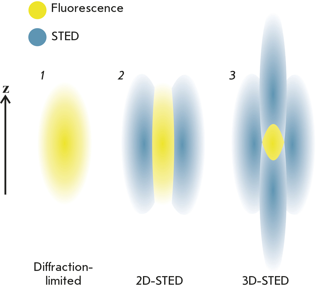 Fig. 9. Narrowing of the effective radiation area due to STED suppression of peripheral radiation. 1 – diffraction-limited fluorescent PSF. 2 – the torus-shaped STED beam narrows the diameter of the fluorescent PSF. 3 – fluorescent PSF in the case of 3D-STED