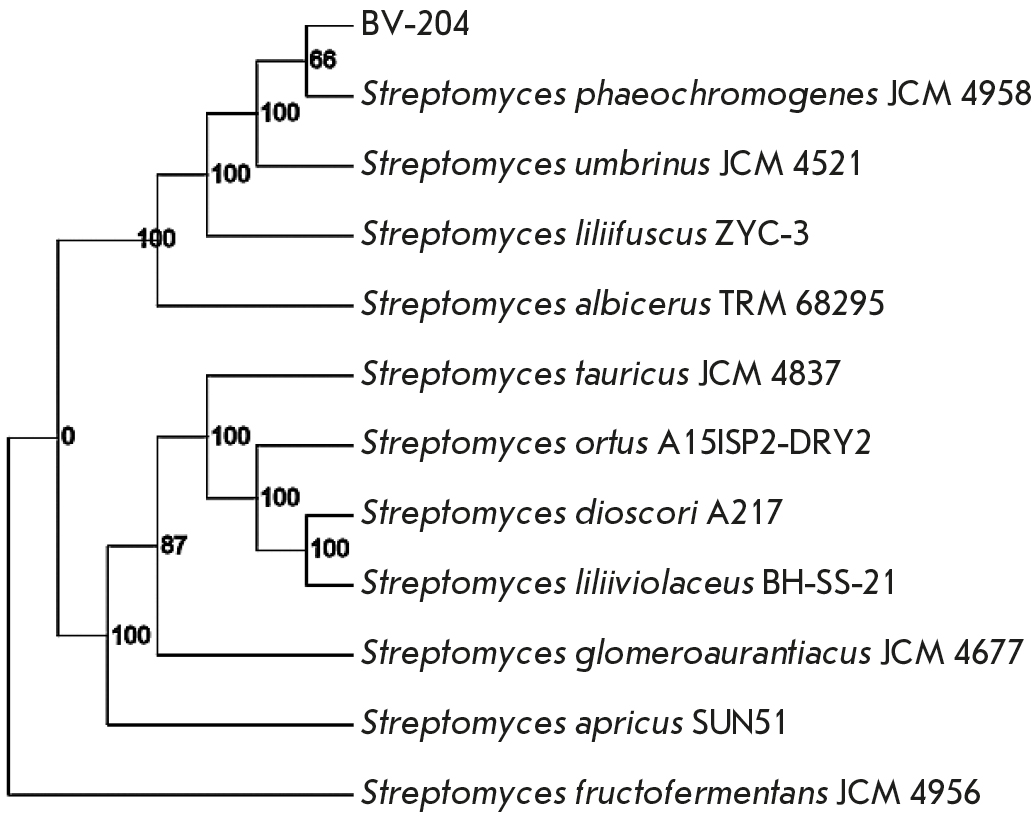 Fig. 1. Phylogenetic tree based on the complete genome of S. phaeochromogenes BV-204. The bootstrap analysis values are above 60%