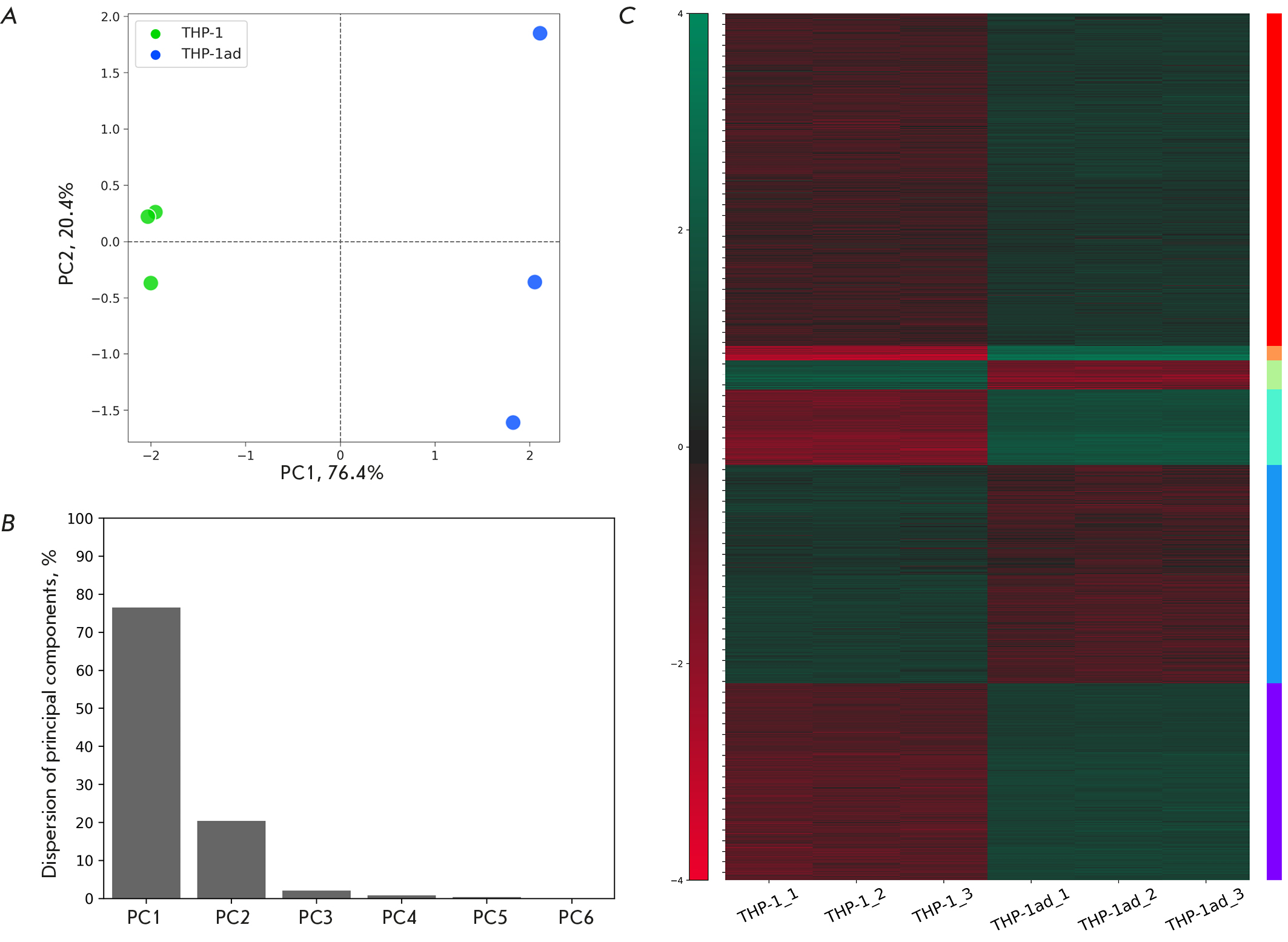 Fig. 1. Comparative analysis of gene expression variations between THP-1ad and THP-1 cells. An analysis using principal component analysis was conducted for gene expression data to identify changes in expression between two experimental groups (A). Allocation of variation among the major components (B). Clustering of differentially expressed genes (DEGs) with significant changes in expression (C)