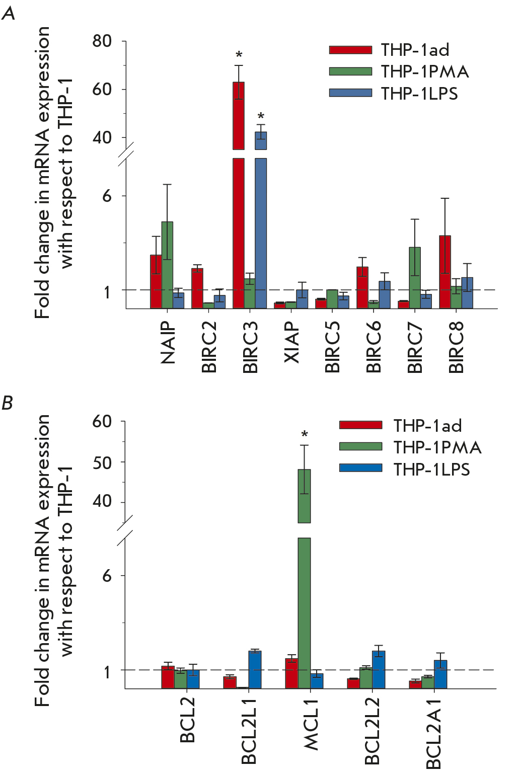 Furthermore, expression of all the anti-apoptotic members of the IAPs and BCL-2 family in macrophage-like THP-1ad clones and in parent THP-1 cells was revealed by quantitative reverse transcription PCR. Additionally, expression of these genes was analyzed in THP-1 cells treated with forbol ether (THP-1PMA) and LPS (THP-1LPS), known inducers of macrophage differentiation and activation of proinflammatory signaling pathways, respectively [56, 57].