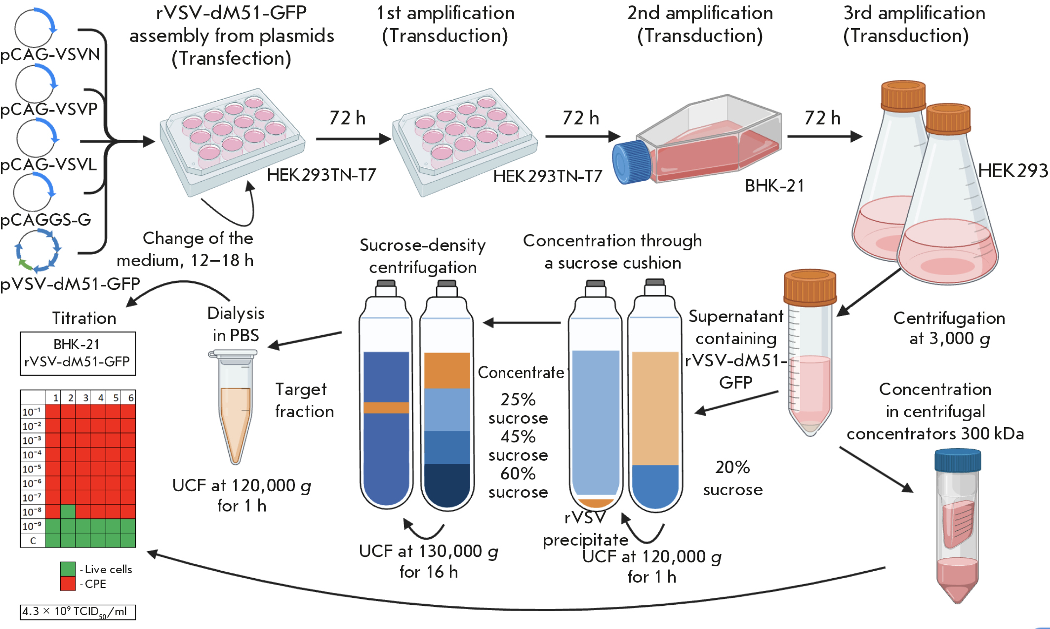 Oncolytic viruses have long been considered as a potent antitumor drug. To date, the development of new oncolytic viruses is one of the priority areas of tumor immunotherapy. According to recent data, there are currently more than 200 clinical trials on the safety and effectiveness of oncolytic virus-based drugs [1, 2]. The RNA-containing vesicular stomatitis virus (VSV) effectively infects different human and animal cells while being non-pathogenic to humans. Low virulence, a rapid replication cycle in the cytoplasm (without integration into the genome), possibilities to obtain high virus titers when producing VSV in mammalian (BHK-21 and HEK293) cells and genetically modify viruses, as well as the absence of neutralizing antibodies in the human population, make VSV an ideal candidate for producing viral vaccines, transgene delivery vectors, and oncolytic viruses [3–5]. Assembly of such rVSVs as rVSV-dG-GFP involves transfection of BHK-21 cells with five plasmids and co-infection of cells with either the vaccinia virus (VV) or another virus expressing T7 DNA-dependent RNA polymerase (T7 RNA polymerase) [6]. When generating biotechnological products for further use as drugs, it is necessary to minimize the number of helper viruses, in particular the replication-competent ones, since the latter can cause viral contamination. In addition, the resulting drug preparation should not contain VV or other virus particles [7]. There are currently few works with a comprehensive and detailed description of all stages of the production, purification, concentration of VSV-based oncolytic viruses, and assessment of their functional activity for further studies. This paper presents a method for the production of purified replication-competent model rVSV encoding the green fluorescent protein (rVSV-dM51-GFP) without the use of a helper virus.