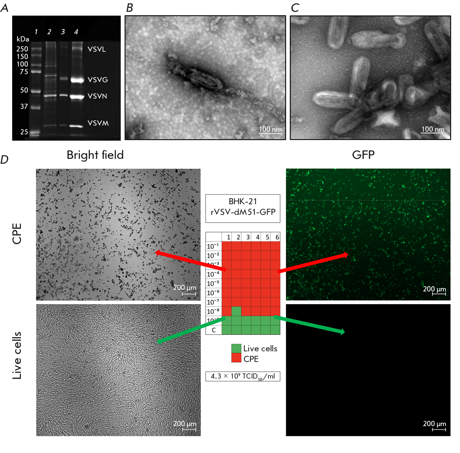 4. Fig. 3. Analysis of rVSV-dM51-GFP samples. (A) – SDS-PAGE (from left to right): 1 – protein molecular weight marker (10–250 kDa), 2 – rVSV-dM51-GFP supernatant after CF at 3,000 g, 3 – rVSV-dM51-GFP fraction after the second UCF stage, 4 – purified rVSV-dM51-GFP after the third UCF stage; (B) – STEM micrograph image of rVSV-dM51-GFP before UCF purification (magnification, × 130,000). (C) – STEM micrograph of rVSV-dM51-GFP after UCF purification (magnification, × 130,000). (D) – TCID50/ml in BHK-21 cells and the micrographs of BHK-21 cells in the presence (top) and absence (bottom) of CPE