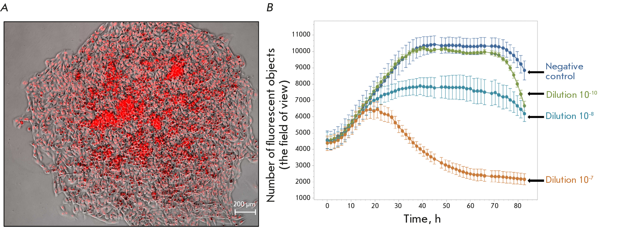 5. Fig. 4. The dose–response relationship for rVSV-dM51-GFP in B16F10Red cells. (A) – micrographs of B16F10Red cells; (B) – CPE in B16F10Red cells after addition of rVSV-dM51-GFP at different dilutions