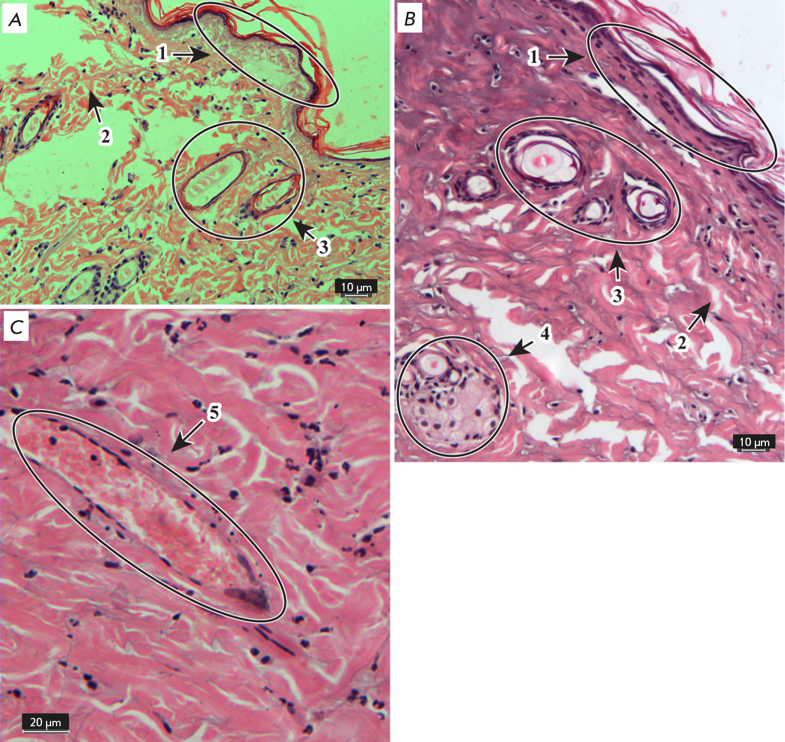Fig. 5. Morphological changes in the skin with burn injury after application of liposomes with 90% of phosphatidylcholine. Hematoxylin and eosin stain. ×20 (A, B) and ×40 (C) objectives.1 – epidermis,2 – dermis,3 – hair follicles,4 – sebaceous glands, 5 – blood vessels