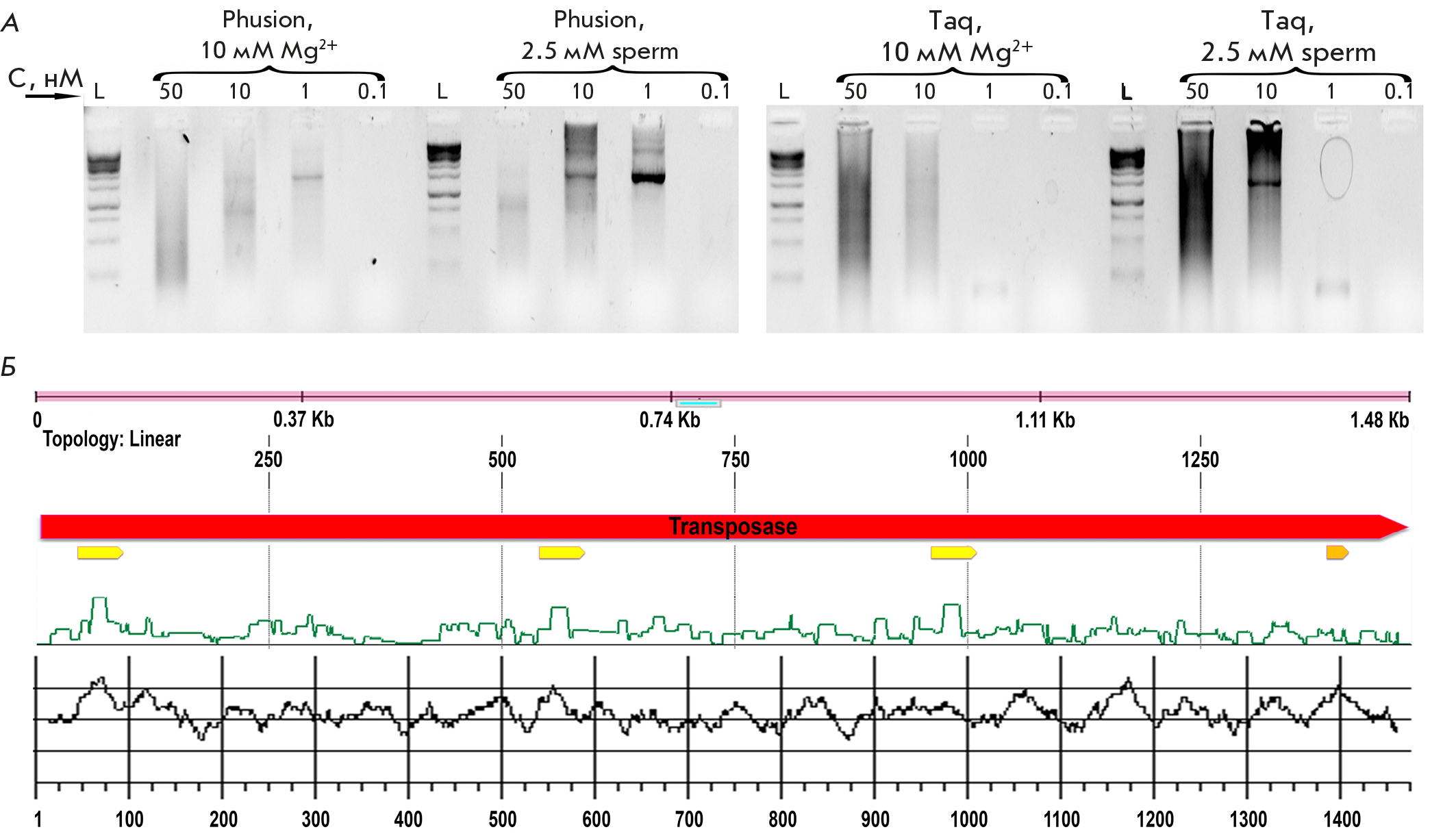 Рис. 2. A – оптимизация условий сборки гена транспозазы. L – маркер длин GeneRuler 1 kb (Thermo), sperm – спермидин, C – концентрация каждого олигонуклеотида в реакционной смеси; Б – аннотация последовательности транспозазы в окне программы SynthBac. Красной стрелкой обозначена кодирующая рамка транспозазы, желтыми – шпильки, темно-желтой – мотив с потенциальным G-квадруплексом, зеленой линией обозначена возможность образования вторичной структуры. Черная линия на отдельной панели – GC-состав, рассчитанный в окне 20 п.н.
