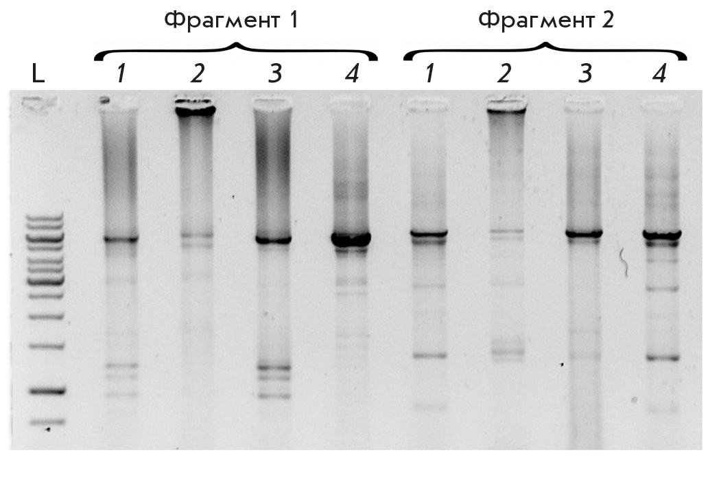Рис. 5. Оптимизация условий объединения пяти фрагментов по 1.5 т.п.н. Фрагмент 1 и фрагмент 2 – разные фрагменты вибриофага N4, L – маркер длин GeneRuler 1 kb (Thermo), 1 – обычные условия объединяющего ПЦР, 2 – ПЦР с добавлением 2.5 мМ спермидина, 3 – ПЦР после реакции Гибсона, 4 – ПЦР с элонгацией на 65°С и увеличенным временем элонгации