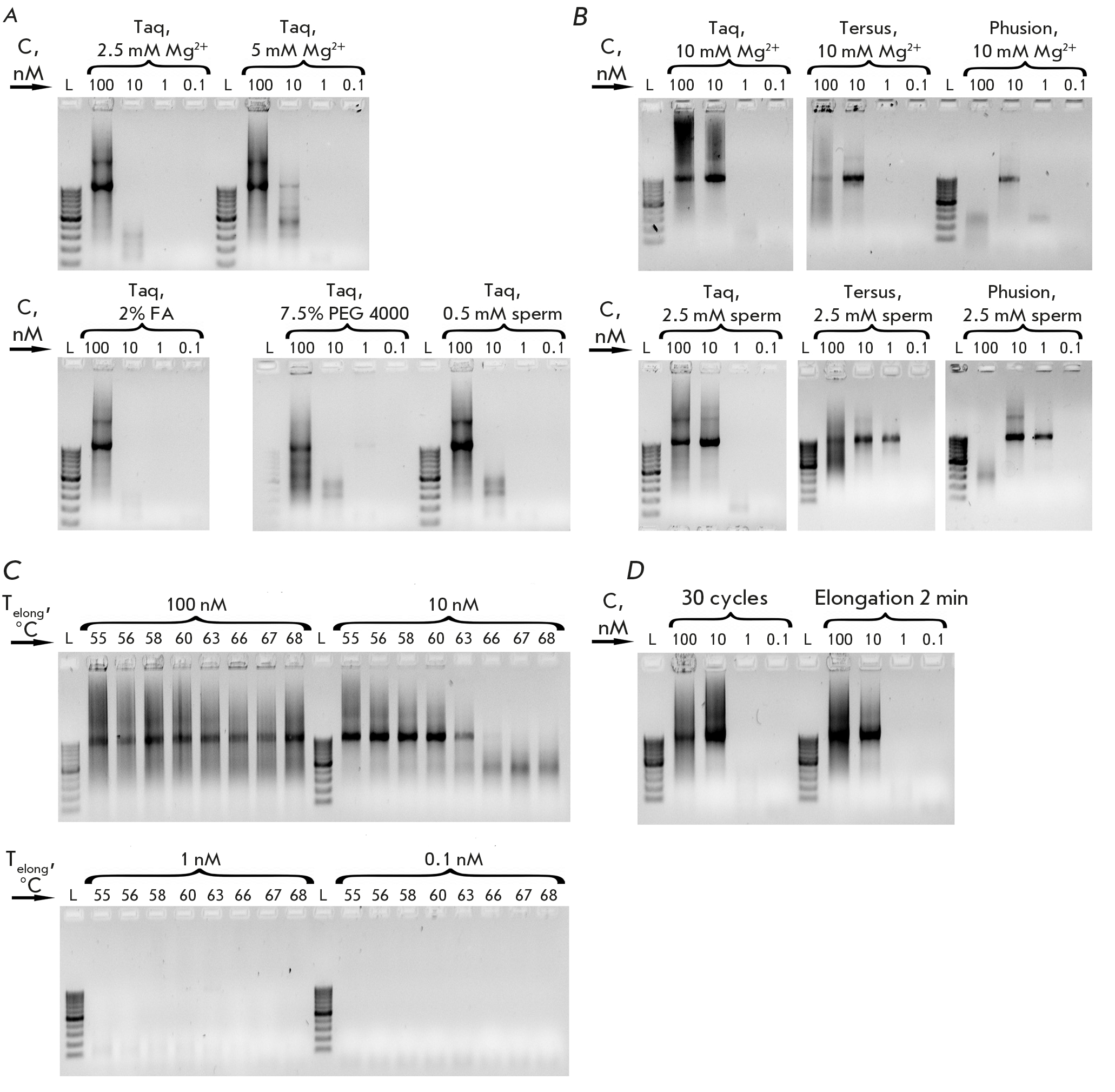 Fig. 1. Optimization of assembly conditions for a 1 kb model fragment. (A) – assembly of the fragment using additives in the reaction mixture that do not significantly affect the assembly efficiency. (B) – assembly of fragments by various polymerases using additives in reaction mixtures that improve the efficiency of assembly. (C) – assembly at different annealing temperatures. (D) – assembly with variation in the number of cycles or elongation time. L is the length marker GeneRuler 100 bp (Thermo), sperm is spermidine, C – each oligonucleotide concentration in the reaction mixture