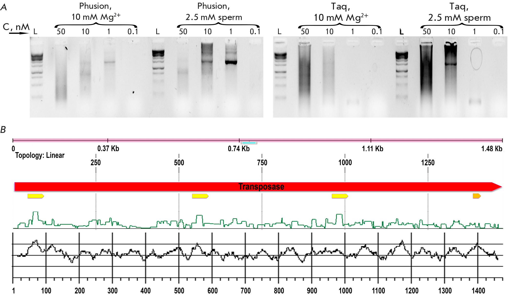 Fig. 2. (A) – Optimization of transposase gene assembly conditions. L is the length marker GeneRuler 1 kb (Thermo), sperm is spermidine, C – each oligonucleotide concentration in the reaction mixture; (B) – Annotation of the transposase sequence in the SynthBac program window. The red arrow indicates the coding frame of the transposase, the yellow one indicates the hairpin, the dark yellow one indicates the motif with a potential G-quadruplex, and the green line indicates the possibility of formation of a secondary structure. The black line on the bottom panel shows the GC composition calculated in the window of 20 bp