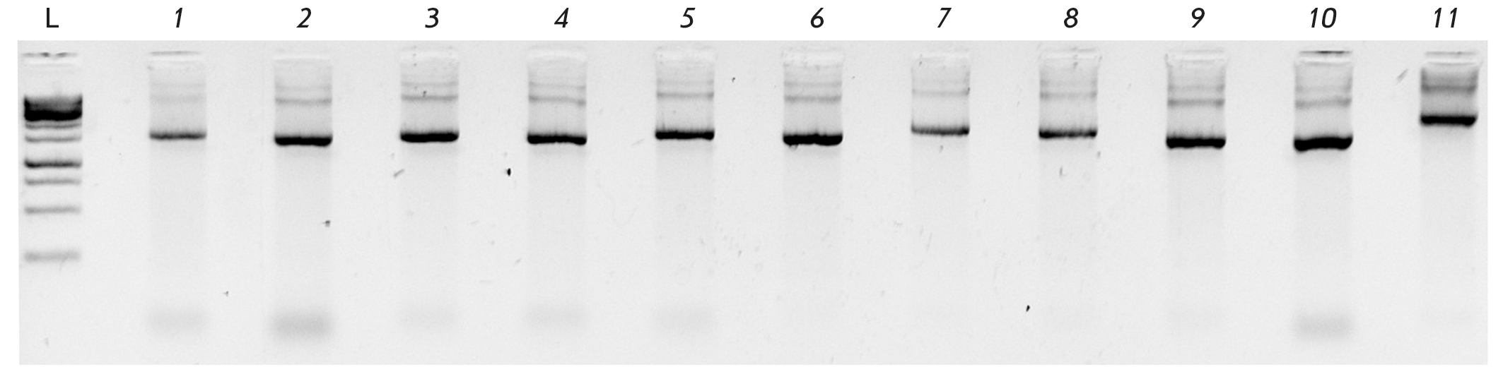Универсальность предложенных условий для сборки разнообразных последовательностей подтвердили, успешно собрав 11 различных фрагментов ДНК длиной около 1.5 т.п.н. при добавлении в реакционную смесь спермидина на первой стадии сборки (рис. 3).