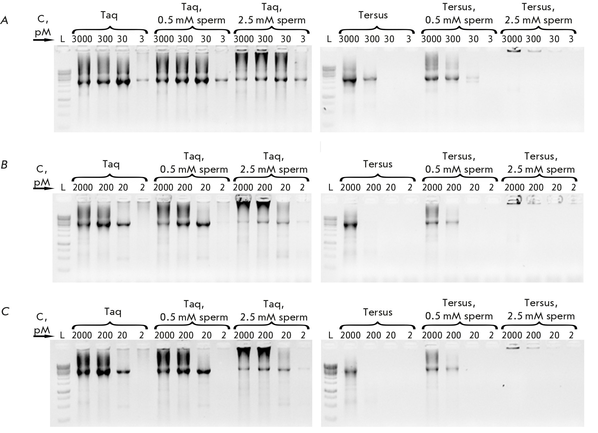 Фрагменты дцДНК длиной 1009 (фрагмент 1), 1152 (фрагмент 2) и 1254 (фрагмент 3) п.н., полученные после сборки из олигонуклеотидов, использовали для объединения в пары (2 и 3) и тройки (1, 2 и 3). Количество матрицы, добавляемой в реакцию, варьировали. При объединении пары фрагментов концентрация каждого из них в реакционной смеси составила 3 нМ, 300 пМ, 30 пМ и 3 пМ; тройки – 2 нМ, 200 пМ, 20 пМ, 2 пМ. Концентрацию фрагментов измеряли с помощью флуориметра Qubit (Thermo) и набора dsDNA BR Assay Kit (Thermo). При сборке трех фрагментов ампликоны вносили как без очистки (в виде реакционной смеси после сборки из олигонуклеотидов), так и очищенные на магнитных частицах NEBNext Sample Purification beads (NEB) по протоколу производителя. Каждый образец содержал 0.4 мкл полимеразы Taq (5 ед./мкл, «Литех») или Tersus (50X, «Евроген»), соответствующий коммерческий буфер, 0.2 мМ dNTP и пару праймеров с конечной концентрацией в смеси 0.25 мкМ. Реакцию амплификации проводили при концентрациях спермидина 0, 0.5 либо 2.5 мМ. Условия проведения амплификации: 95°C 3 мин, затем 20 циклов – 95°C 30 с, 62°C 30 с и 72°C 5 мин, в конце достройка 5 мин.