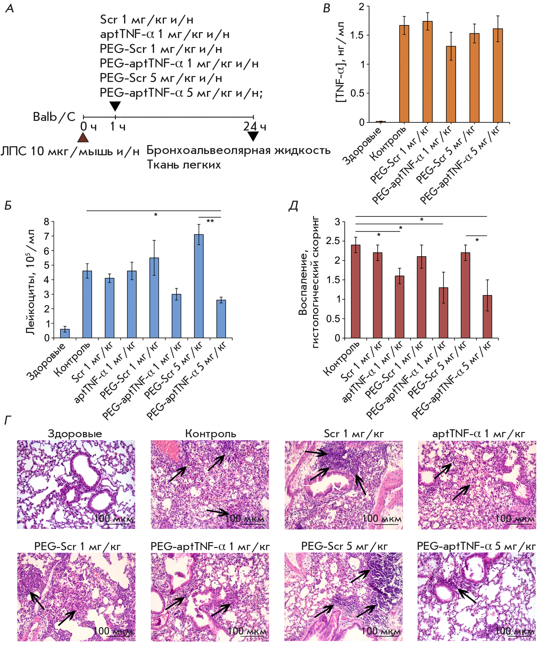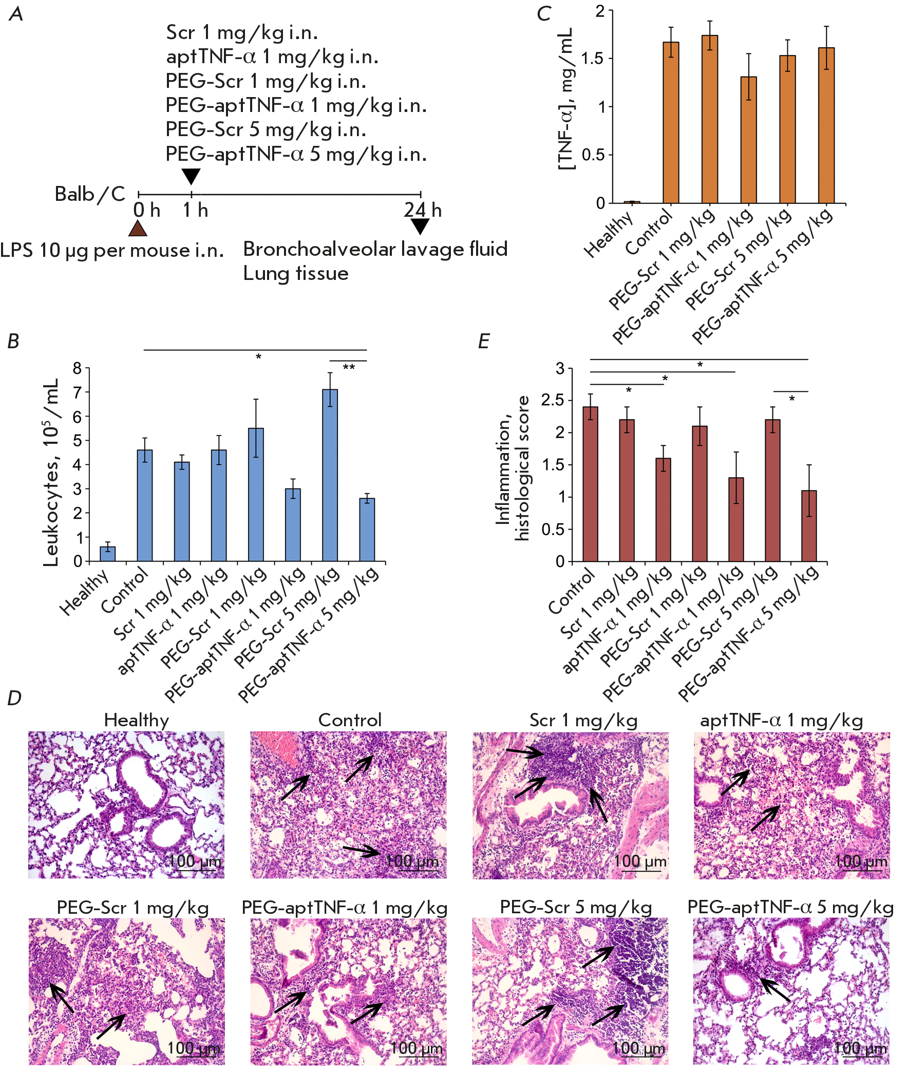 Fig. 2. The effect of TNF-α-targeting aptamers on the development of LPS-induced acute lung injury in mice.(A) Experimental design. Acute lung injury (ALI) was induced in Balb/C mice by intranasal (i.n.) administration of LPS (10 μg/mouse). Mice were administered i.n. TNF-α-targeting aptamers: aptTNF-α at a dose of 1 mg/kg and PEG-aptTNF-α at doses of 1 and 5 mg/kg 1 h after induction. Mice with ALI without treatment and treated with the scrambled oligonucleotide (Scr and PEG-Scr) were used as controls. Mice were sacrificed 24 h after induction, and material was collected for subsequent analysis. (B, C) The total number of leukocytes (B) and TNF-α level (C) in the bronchoalveolar lavage fluid (BALF) of mice with LPS-induced ALI without treatment and after administration of TNF-α-targeting aptamers. (D, E) Histological examination (D) and semi-quantitative assessment of the intensity of the inflammatory changes (E) in the lungs of mice in the control and experimental groups. Hematoxylin and eosinstaining, original magnification 200×. Black arrows indicate inflammatory infiltration. The following scale was usedto assess inflammation in the lungs: 0 – no pathological changes; 1 – mild inflammation; 2 – moderate inflammation;and 3 – severe inflammatory changes. Data are presented as the mean ± standard deviation; *p < 0.05, **p < 0.01